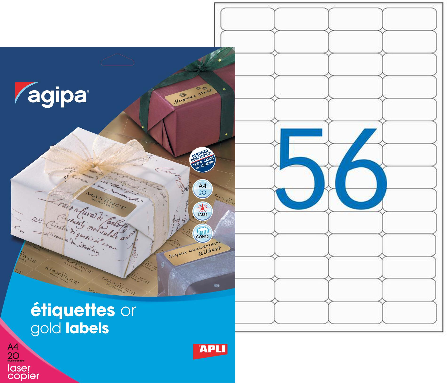 Étiquettes or polyester laser 50x 20 mm. Coins arrondis. Pochette de 20 feuilles A4 laser/copieur (1120 étiquettes).