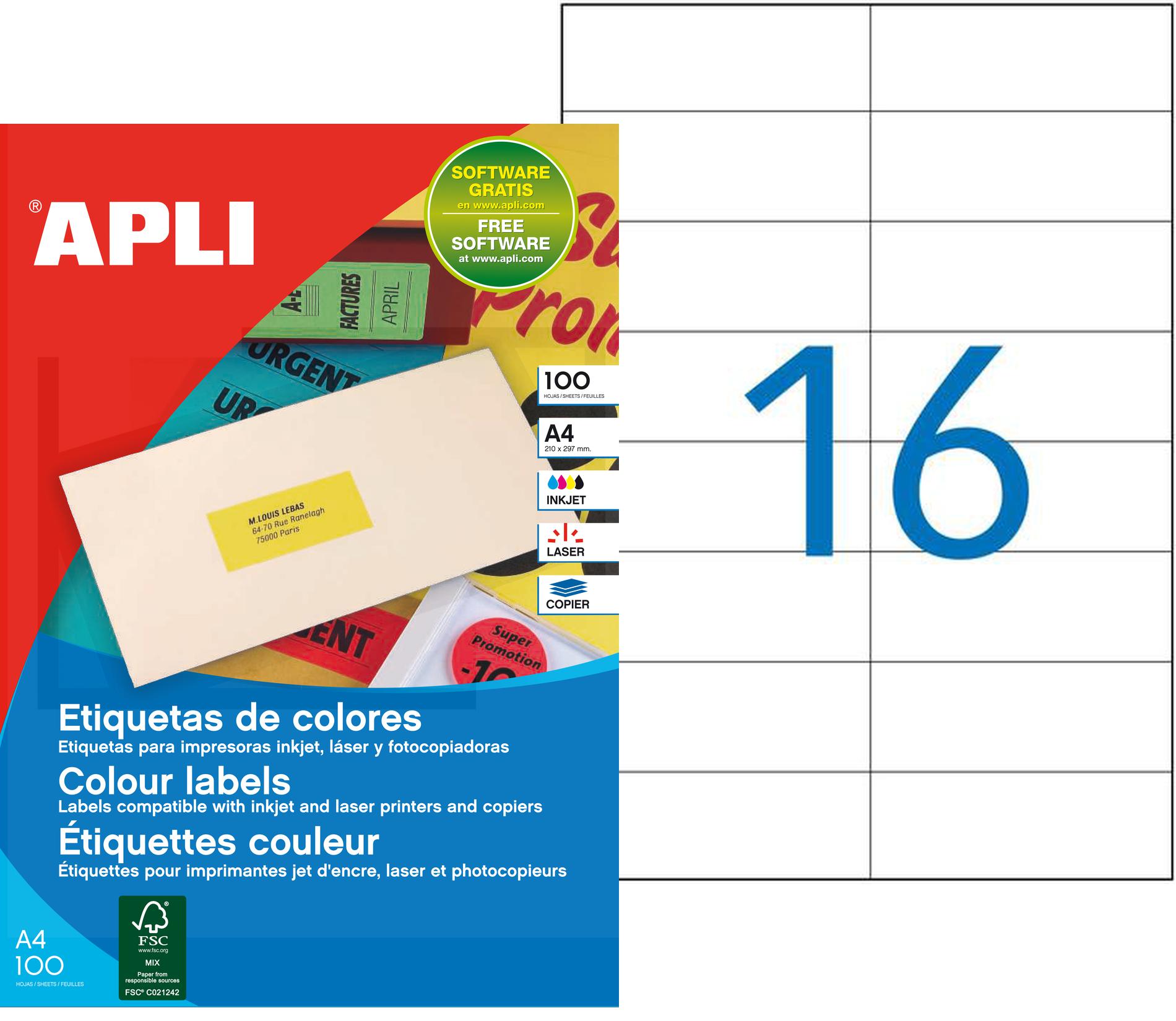 Étiquettes jaunes multi-usage aux bords droits dimensions 105,0 x 37,0 mm avec un adhésif permanent. Paquet de 100 feuilles (1 600 étiquettes). DE QUALITÉ : Les étiquettes Apli sont fabriquées avec un papier de qualité certifié FSC. PRATIQUES : Grâce à leur adhésif résistant aux hautes températures, les étiquettes multi-usages Apli Agipa sont anti-bourrage. Pour vous, ce sera un gain de temps et de papier conséquent. COMPATIBLES : Les étiquettes à imprimer Apli Agipa sont compatibles avec les impressions laser, copieur et jet d’encre. Elles sont réalisées en France avec toute l’expérience d’Apli. FACILES : Tous les formats de nos étiquettes sont présents dans notre logiciel gratuit Agipa Soft Pro, pour vous permettre une personnalisation rapide et aisée. Parfaites pour identifier des envois par courrier, des objets, des colis ou pour classer les documents. Excellente qualité d’impression aux imprimantes ink jet, laser ou copieurs. Téléchargez le logiciel gratuit pour créer et imprimer tout type d’étiquette sur www.apli.fr