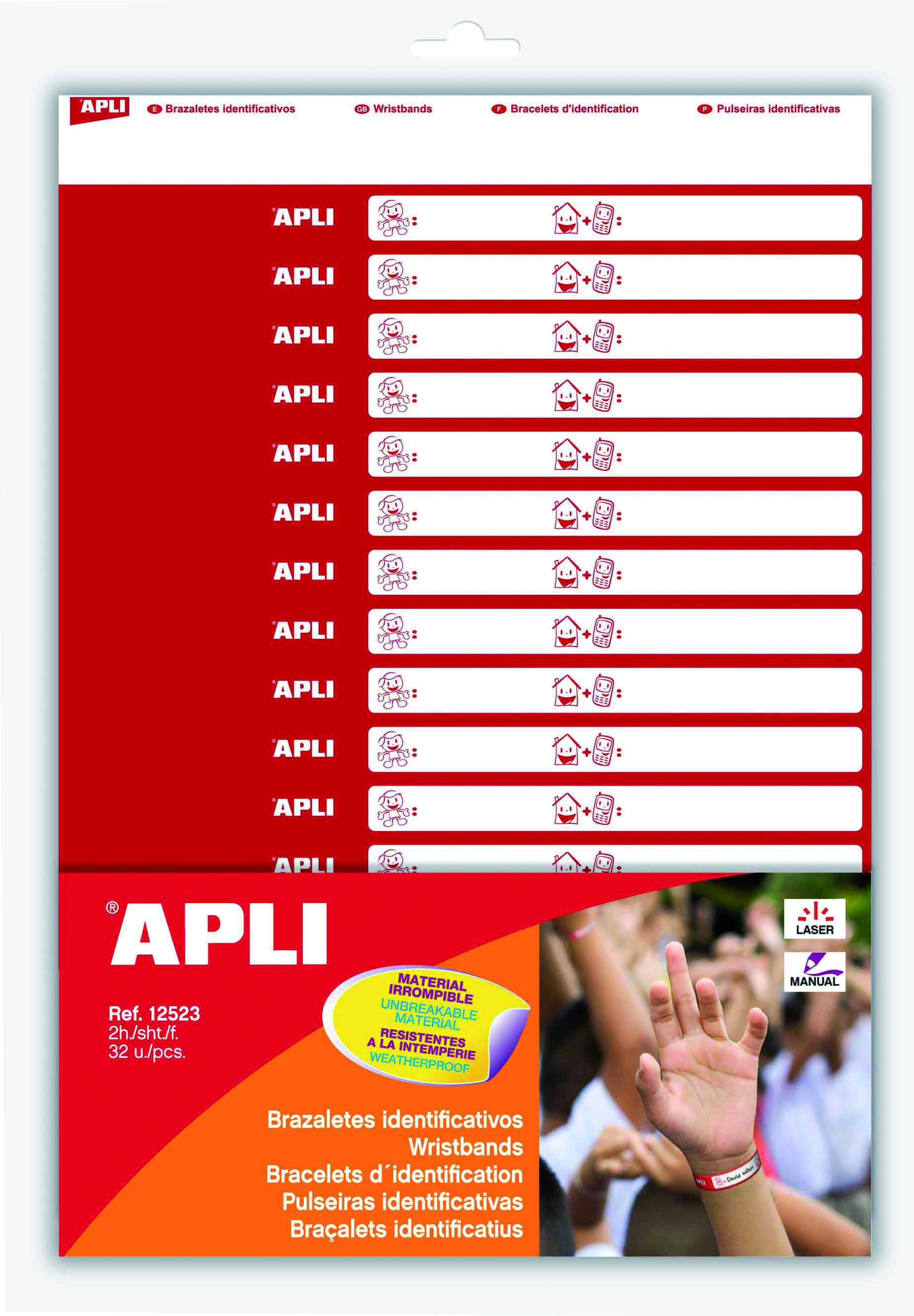 Bracelets d’identification taille 210 x 15 mm. Chaque pochette contient 2 feuilles format A4, 32 bracelets au total.