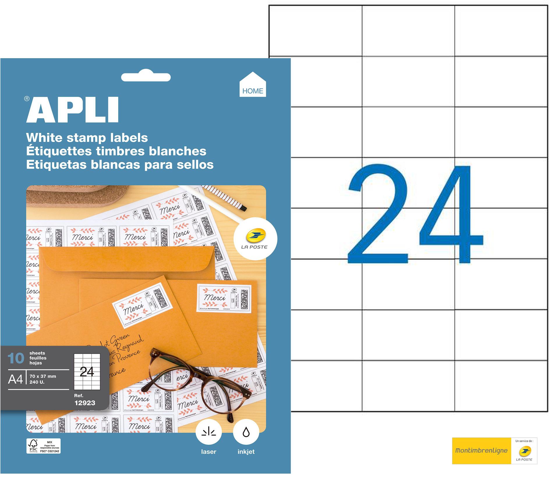 dimensions 70,0 x 37,0 mm avec un adhésif permanent. Paquet de 10 feuilles (240