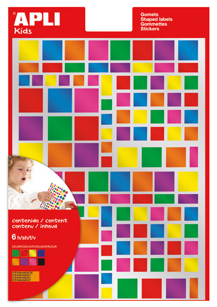Sachet de gommettes carrées avec un adhésif permanent de différentes couleurs avec une finition métallisée : vert, orange, rose, bleu, rouge, lilas et jaune. Dimensions assorties : 9 x 9 mm, 11 x 11 mm, 16 x 16 mm, 20 x 20 mm et 16 x 8 mm. Chaque sachet contient 6 feuilles avec différentes gommettes, un total de 756 gommettes par sachet.