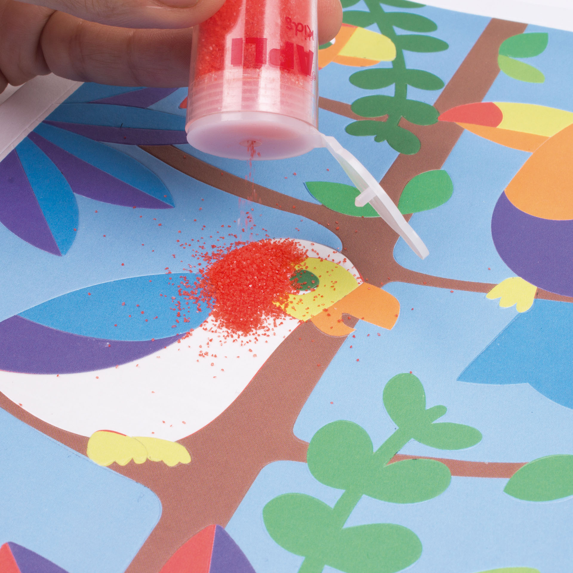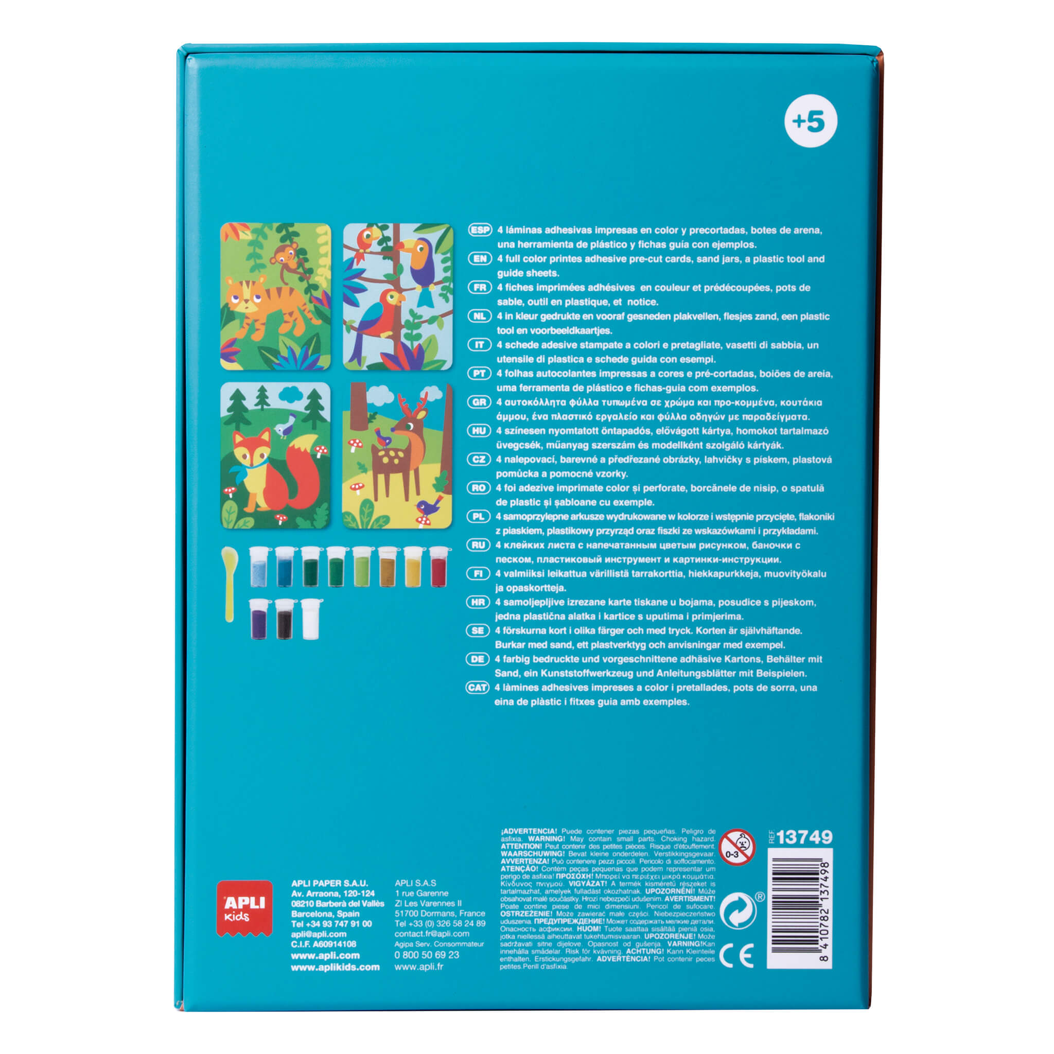 Produit complet, chaque kit contient tout le matériel nécessaire pour réaliser 4 tableaux : 4 supports préimprimés en couleur, 10 pots de sable de différentes couleurs, 1 sachet de sable blanc et un outil en plastique.