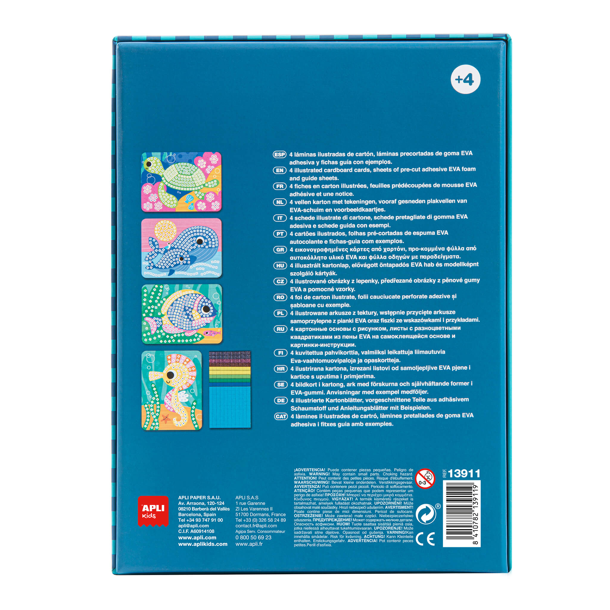 Jeu pour réaliser des mosaïques avec de la mousse EVA adhésive pré-découpée de différentes couleurs et finitions. Modèle La Mer.