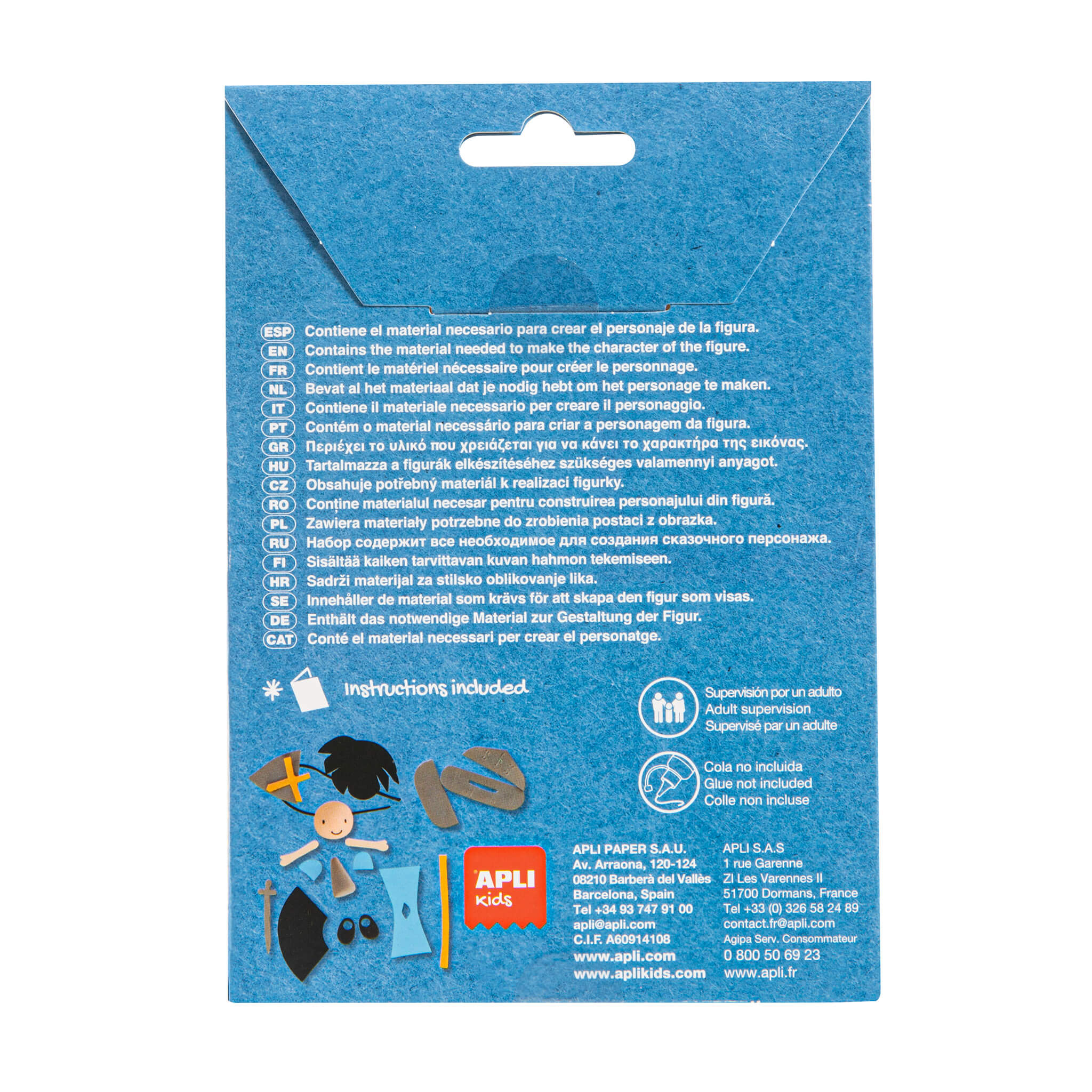 Tout le matériel nécessaire pour créer la figurine illustrée sur la boîte (sauf l’adhésif) et une feuille d’instructions avec la description des étapes.