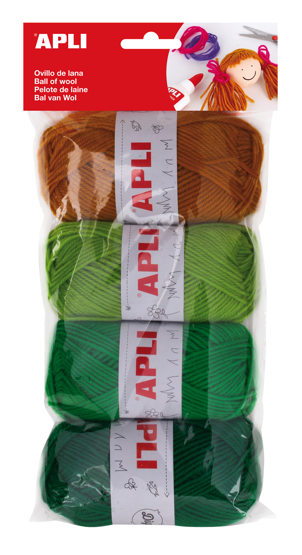 Pelotes de laine 100 % acrylique de différentes nuances de vert et couleurs assorties : vert foncé, vert gazon, vert clair et caramel. Chaque paquet inclut 4 Pelotes de 50 g chacune (environ 90 m).