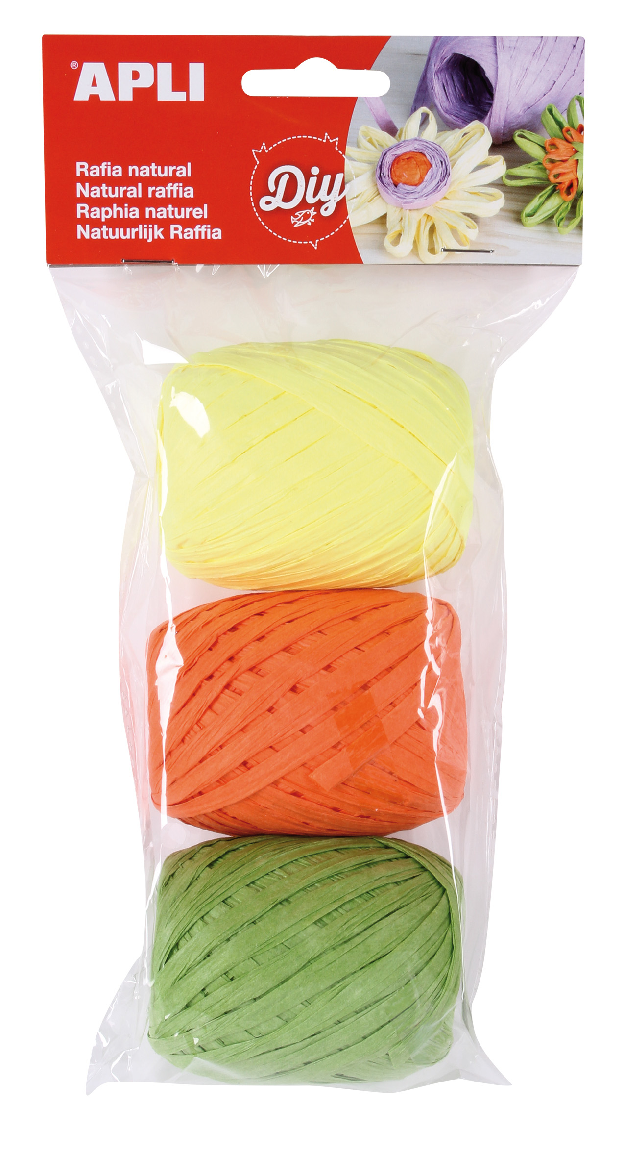 Pelotes de raphia naturel couleurs fluorescentes : jaune, orange et vert. Chaque paquet inclut 3 pelotes de 30 m chacune.