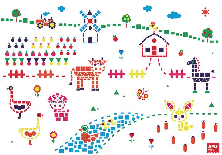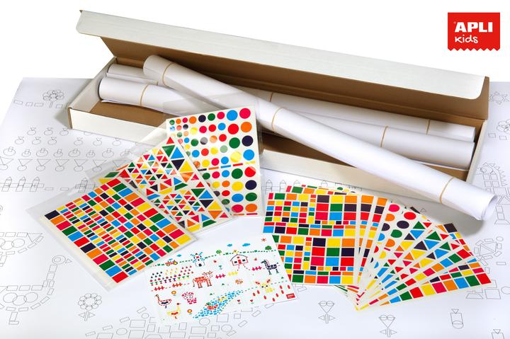 Jeu d'affiches à décorer avec des gommettes. Chaque kit contient 4 affiches enroulées de dimensions 70 x 100 cm, 48 feuilles de gommettes enlevables (12 feuilles par affiche) et 4 notices explicatives (1 par affiche).