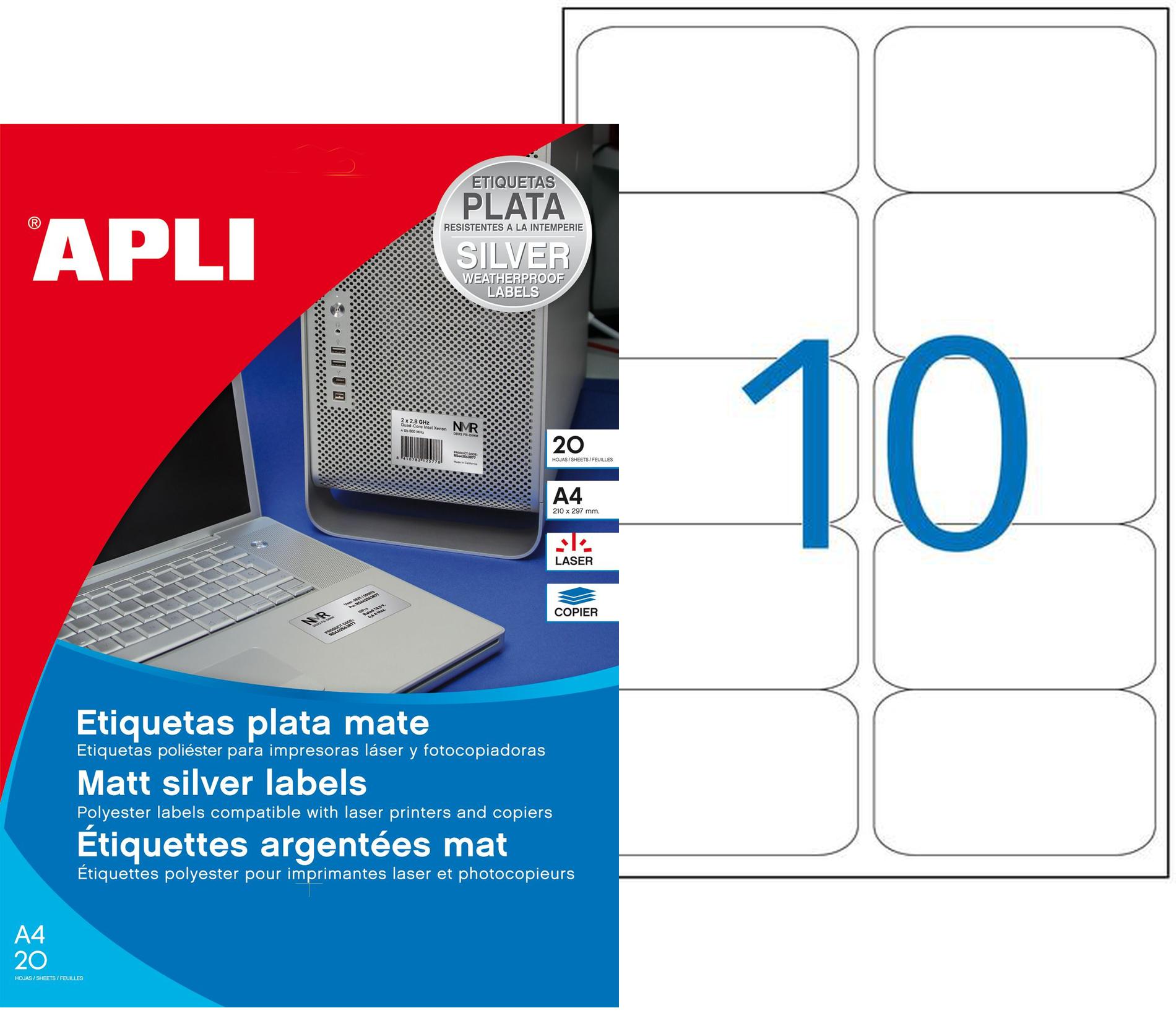 Étiquettes argent polyester laser 96x 50,8 mm. Coins arrondis. Pochette de 20 feuilles A4 laser/copieur (200 étiquettes).