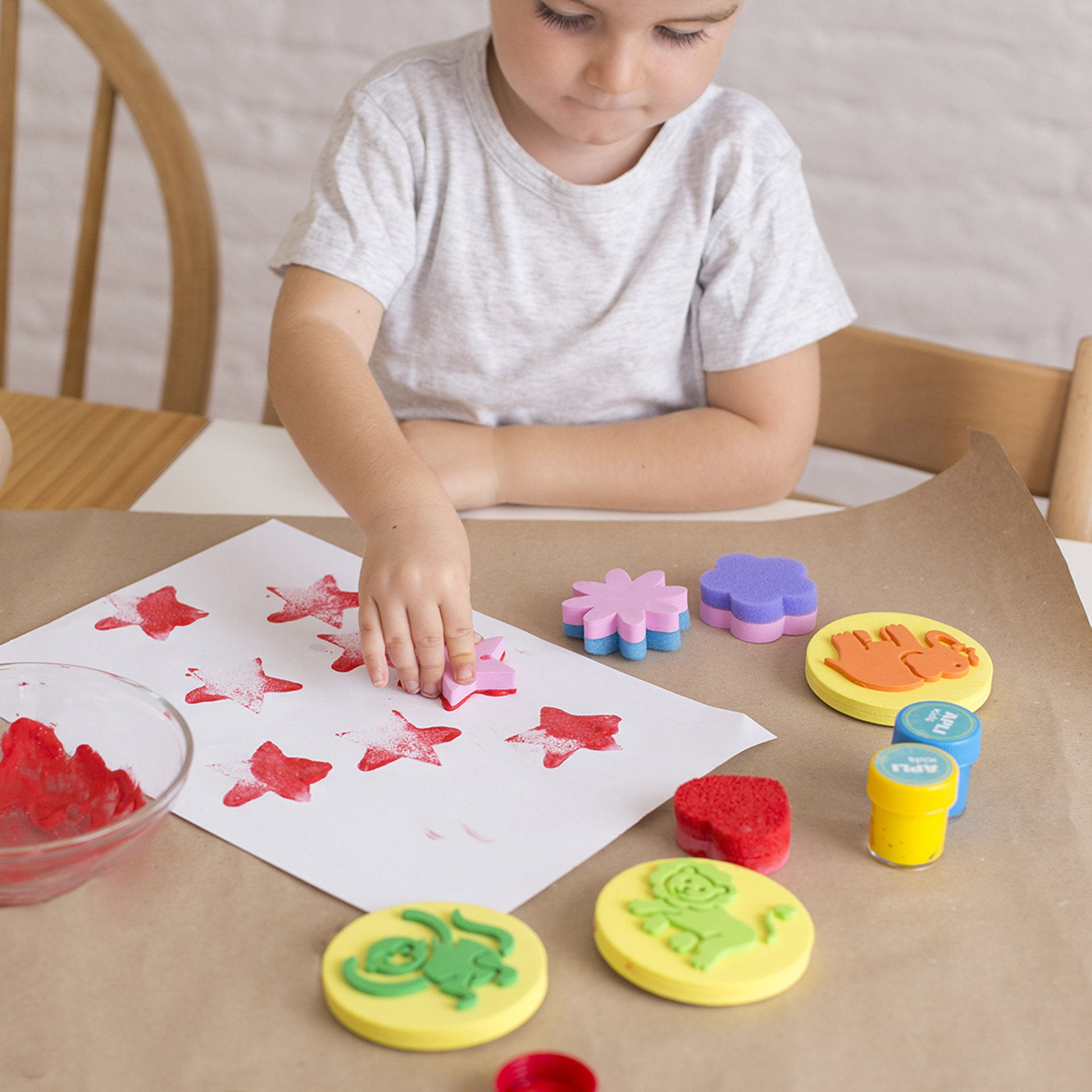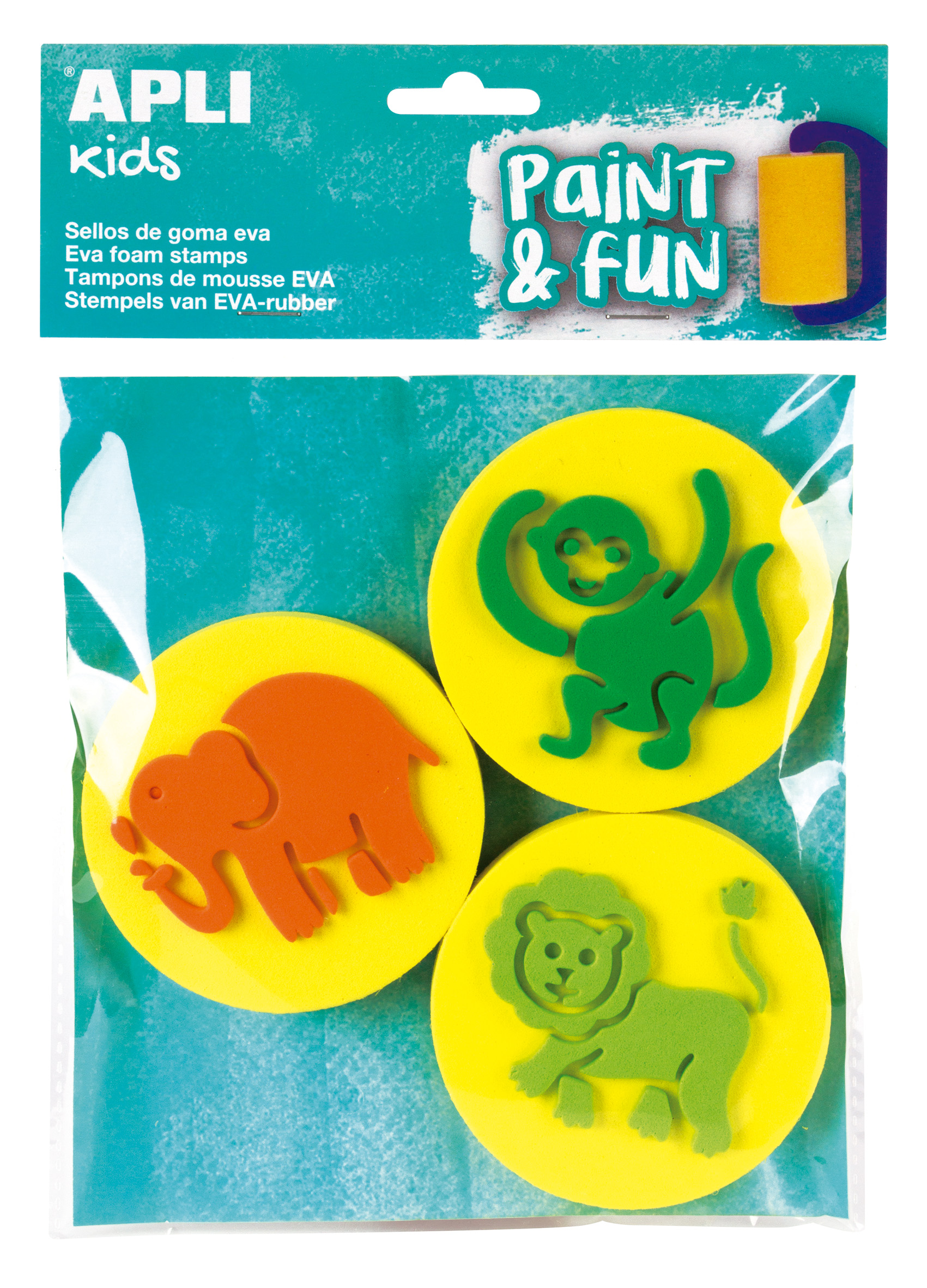 Sachet avec tampons en mousse EVA modèle Animaux. Chaque pack contient 3 tampons dimensions Ø 80 mm de diverses formes d'animaux : éléphant, lion et singe. Produit idéal pour développer l'orientation dans l'espace, la dextérité, la stimulation sensorielle, la créativité et la coordination oculo-manuelle. Les enfants peuvent créer différentes figures avec les tampons, les colorier à leur guise et créer de superbes histoires. Recommandé pour les enfants à partir de 3 ans.