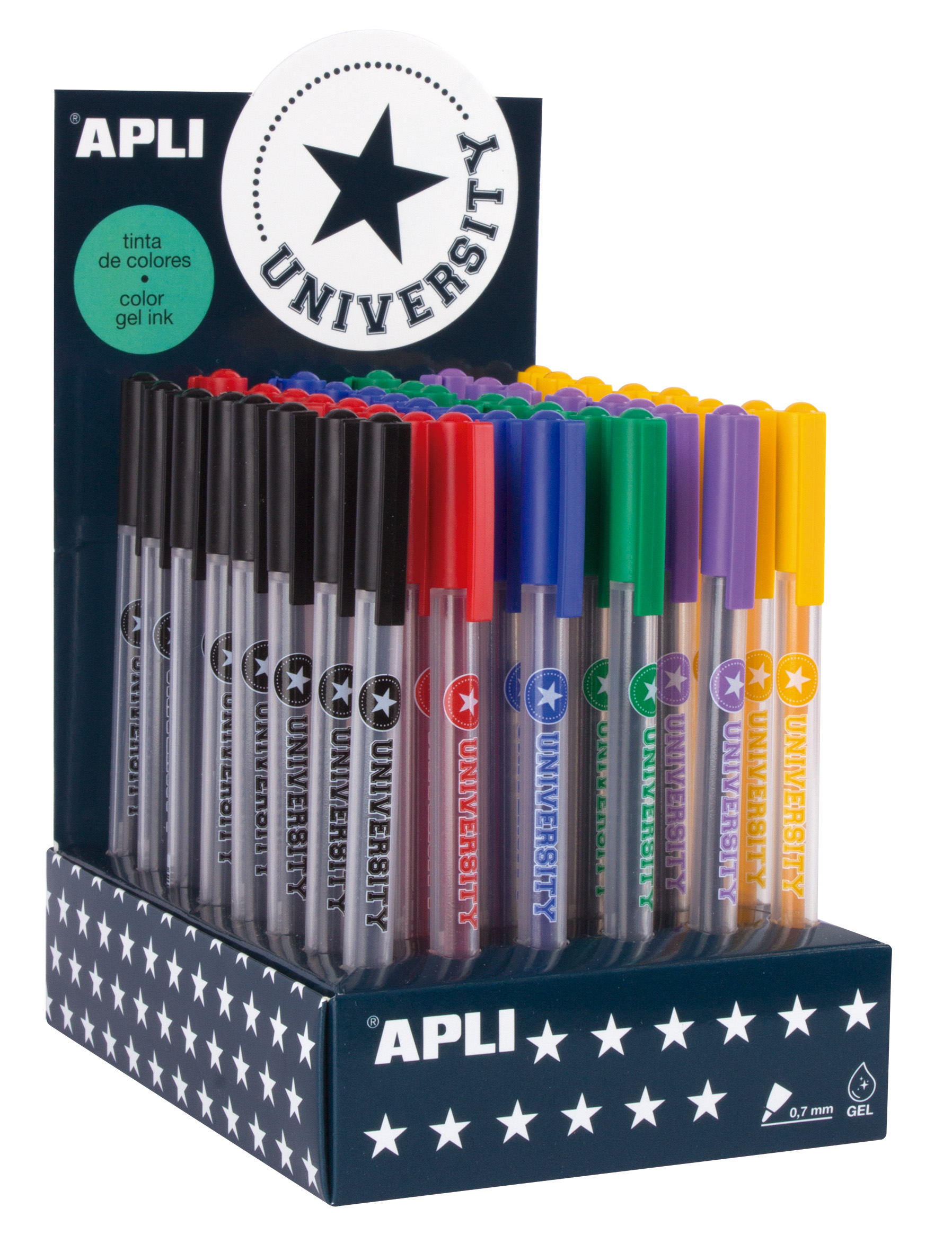 Présentoir de stylos Gel Pen, modèle University. Stylos à encre gel de diverses couleurs : noir, rouge, bleu, vert, violet et jaune. Chaque présentoir comporte 48 stylos (8 par couleur).