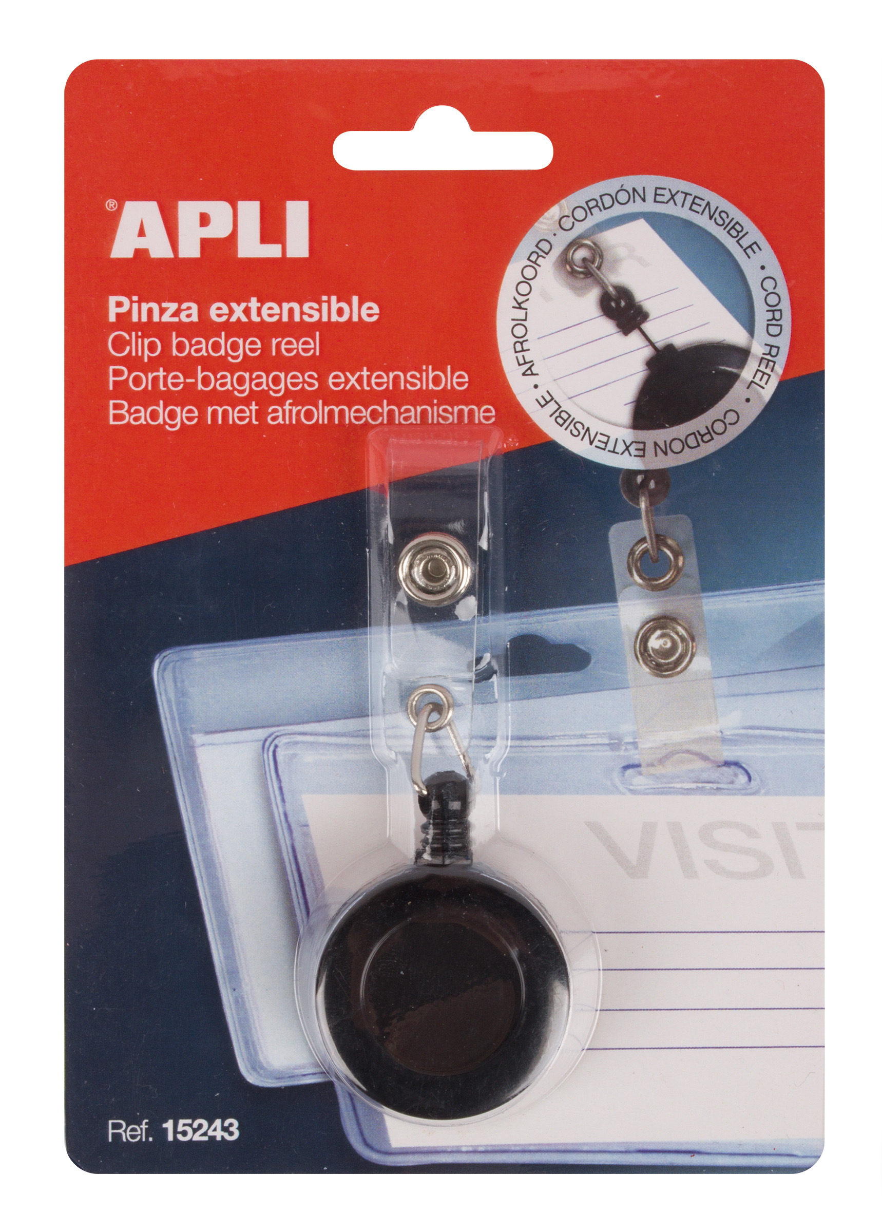 Clip extensible pour badge de couleur noir. Clip métallique sur la partie postérieure et fermeture à bouton pour attacher sur les pochettes porte-cartes. Extensible jusqu’à 80 cm. Idéal pour usage dans des bureaux, écoles, manifestations, réserves, usines etc. Pour le personnel sanitaire, de sécurité, techniciens de laboratoire, pour s’identifier lors de congrès, passages d’accès à des manifestations et autres événements etc.