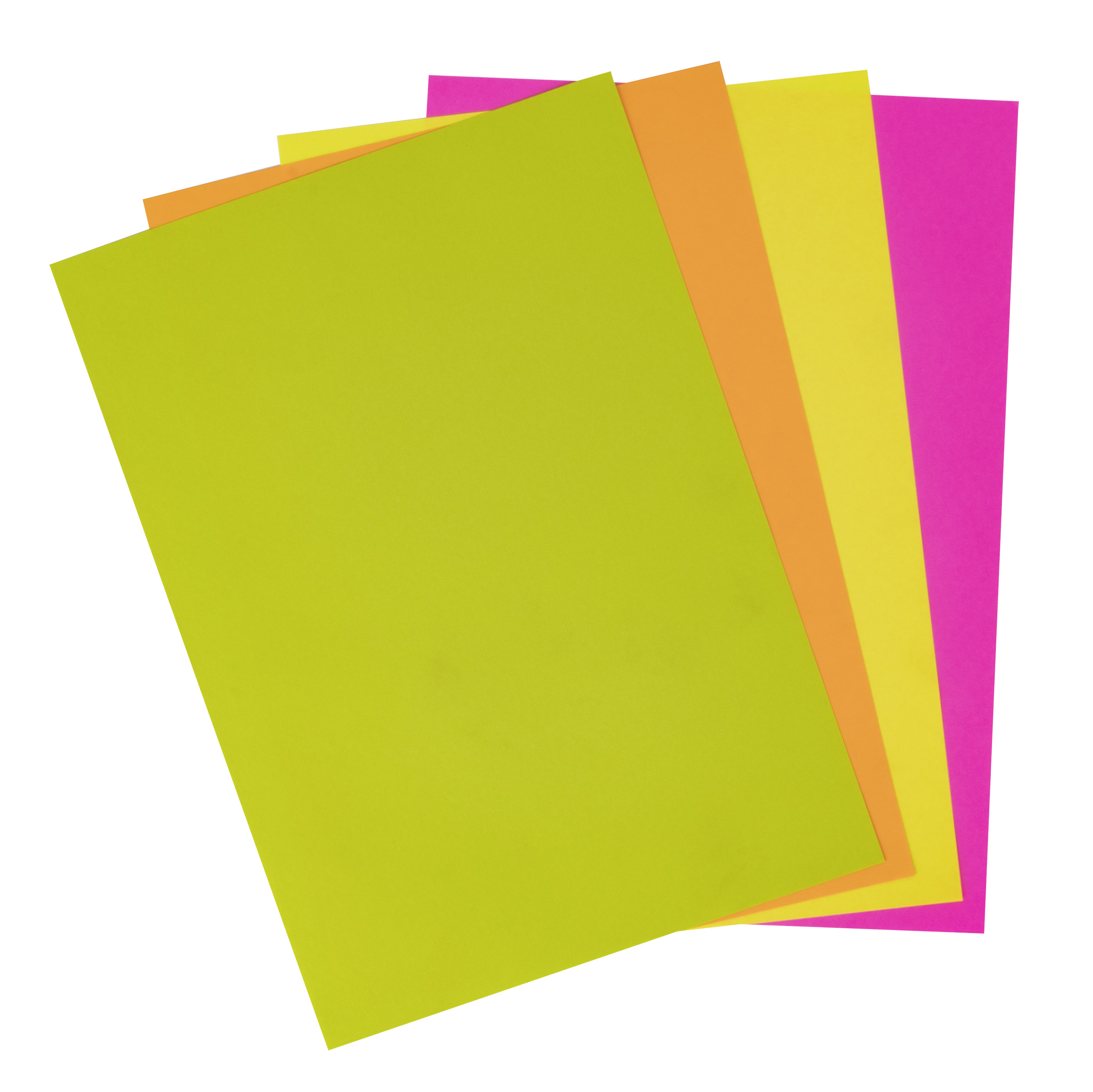 Paquet de feuilles A4 de 80 g/m² de couleurs fluo assorties : rouge, jaune, orange et vert. Chaque paquet comporte 500 feuilles (125 feuilles/couleur).