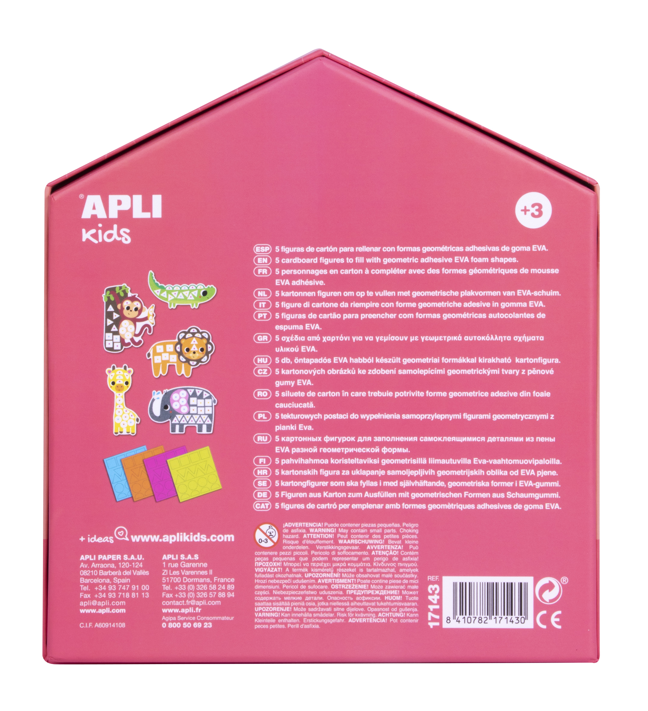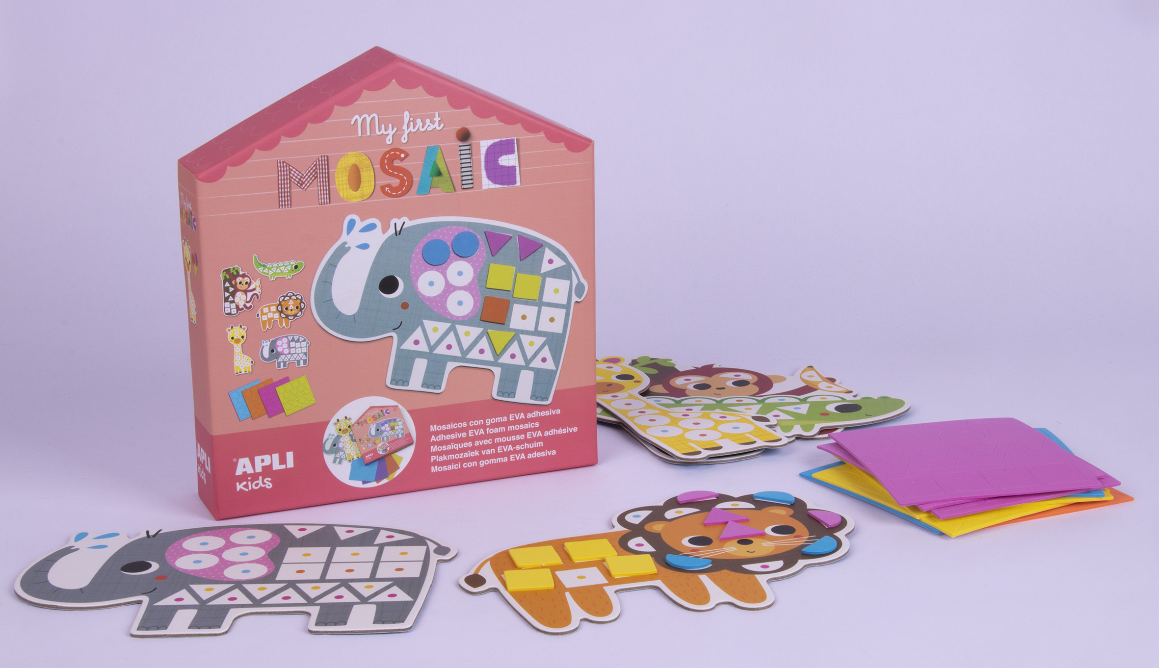 Jeu de mosaïque en mousse dans la collection My First. Jeu de 5 fiches XL pré-découpées en forme de différents animaux de la jungle et 8 feuilles de mousse EVA de 4 couleurs différentes.
