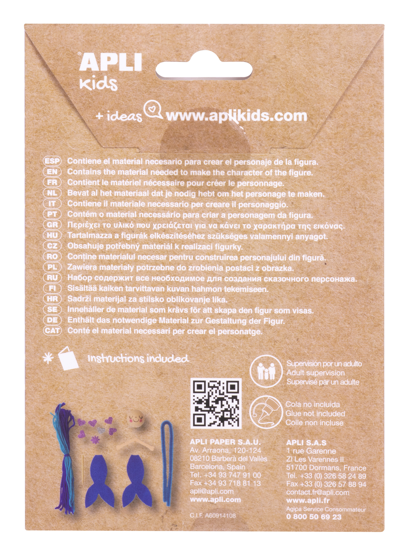 Tout le matériel nécessaire pour créer la figurine illustrée sur la boîte (sauf l’adhésif) et une feuille d’instructions avec la description des étapes.