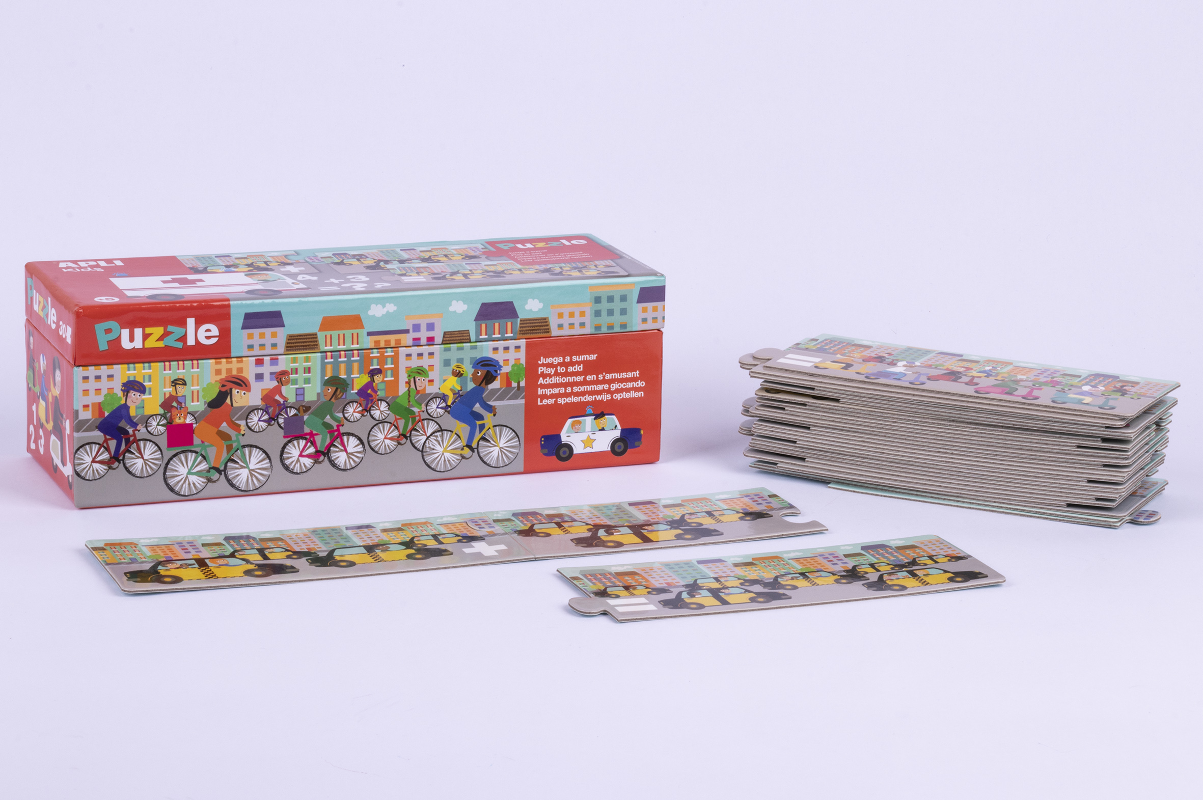 Puzzle pour que les plus petits commencent à se familiariser avec les nombres et les sommes. Chaque puzzle comporte 30 pièces, un total de 10 séquences différentes (chacune au format 49 x 7 cm). Les enfants doivent compter les véhicules dans la rue et trouver les pièces qui correspondent à une somme donnée.