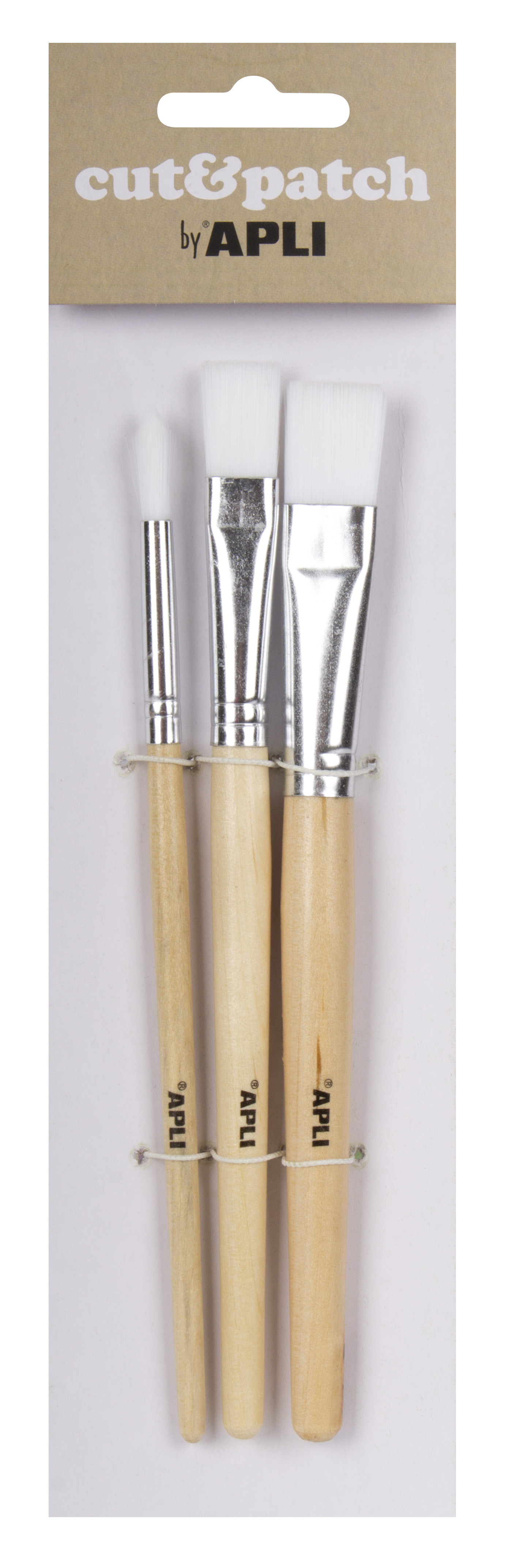 Set de 3 pinceaux, manche en bois, pour les travaux manuels. Pinceaux en poils de nylon en 3 dimensions et aux pointes différentes : nº1 (pointe ronde) nº8 (pointe plate) et nº10 (pointe plate).