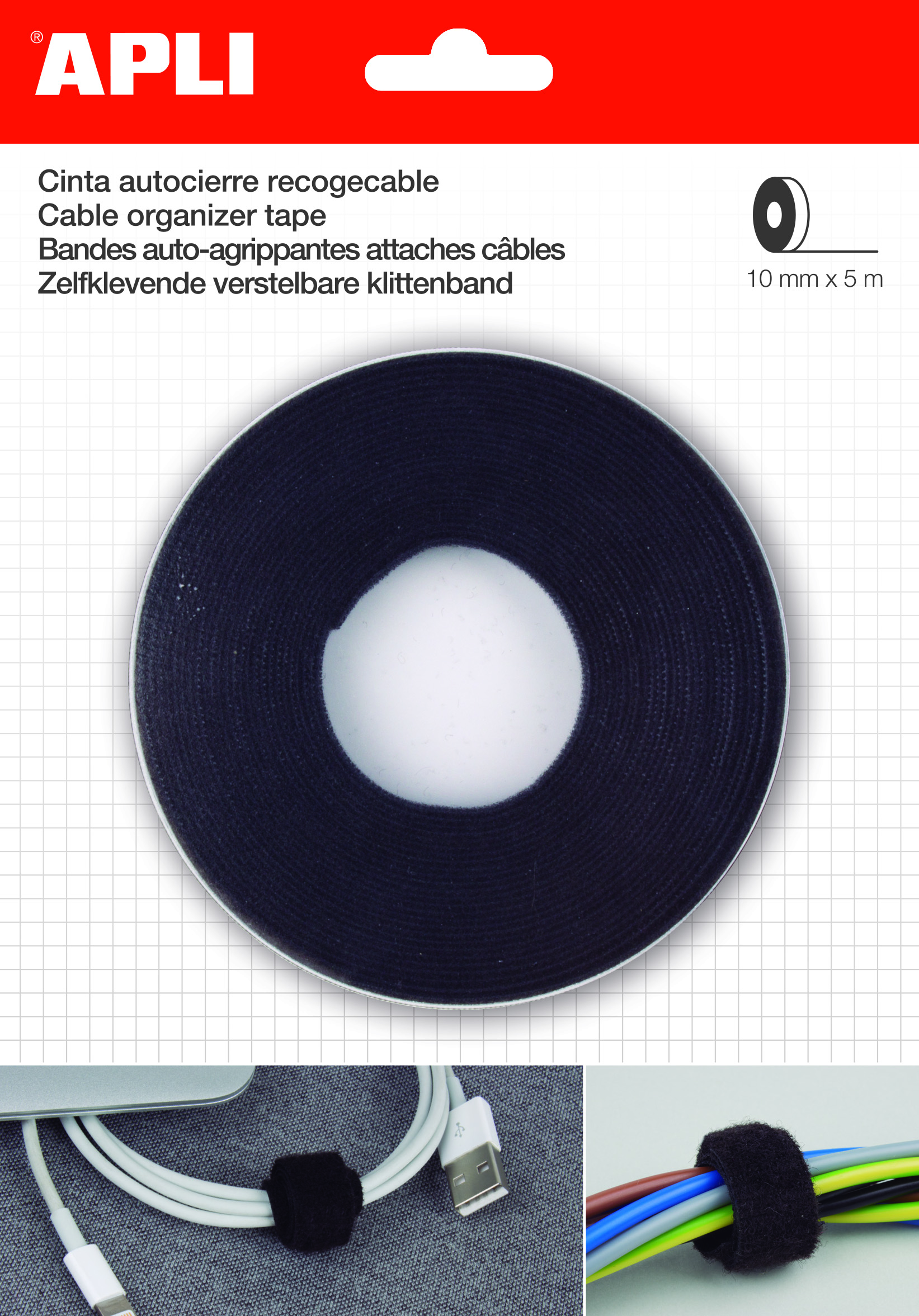 Bande auto-agrippante adhésive noire pour câbles dimensions 10 mm x 5 m. Ruban de fermeture par filaments également connue sur le marché comme fermeture velcro. Ruban pratique et très résistant, idéal pour organiser et ranger les câbles ou autres fils.