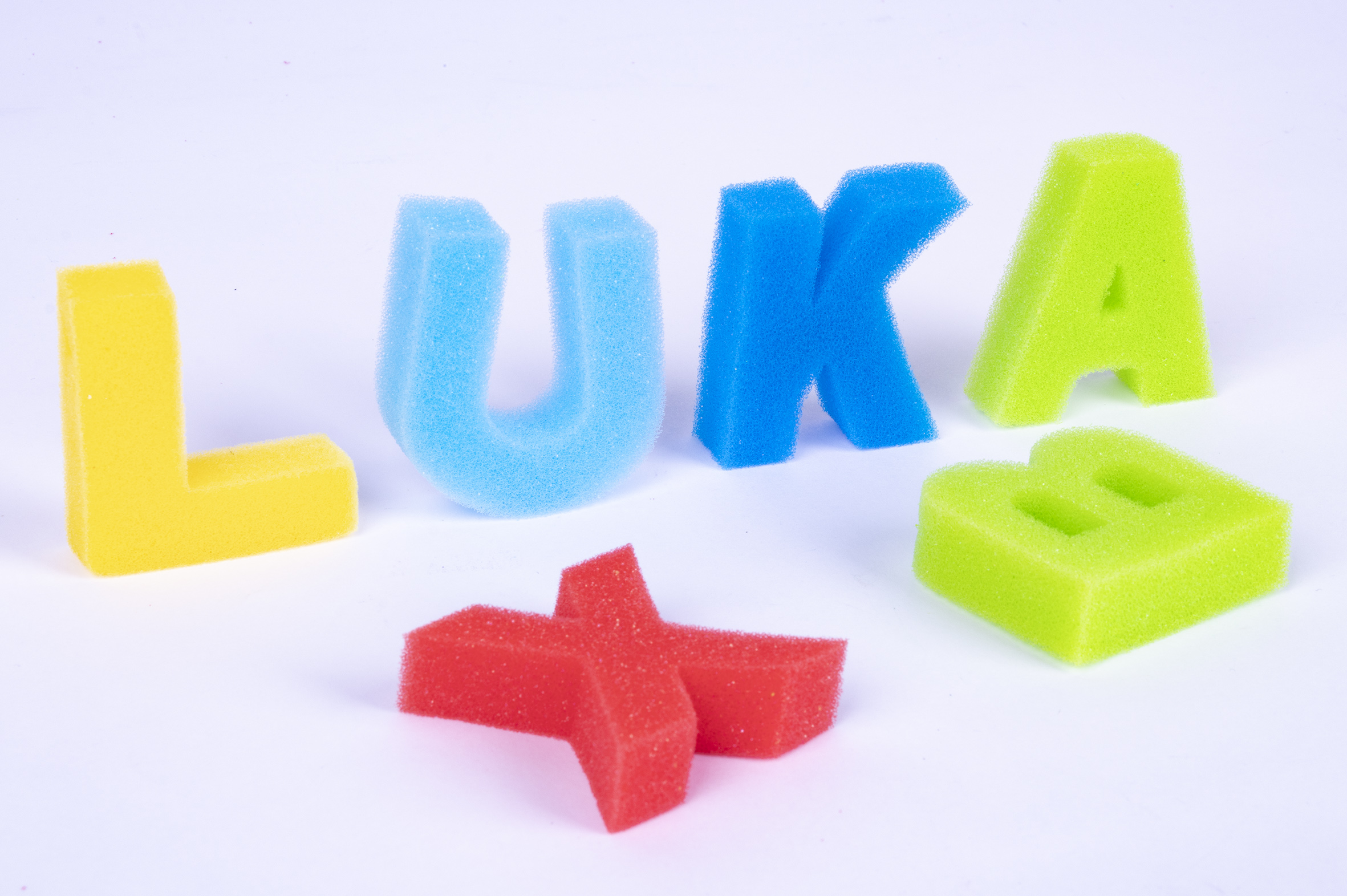 Sachets avec tampons en éponge modèle ABC. Chaque pack contient 26 tampons de dimensions 45 mm avec des formes de lettres.