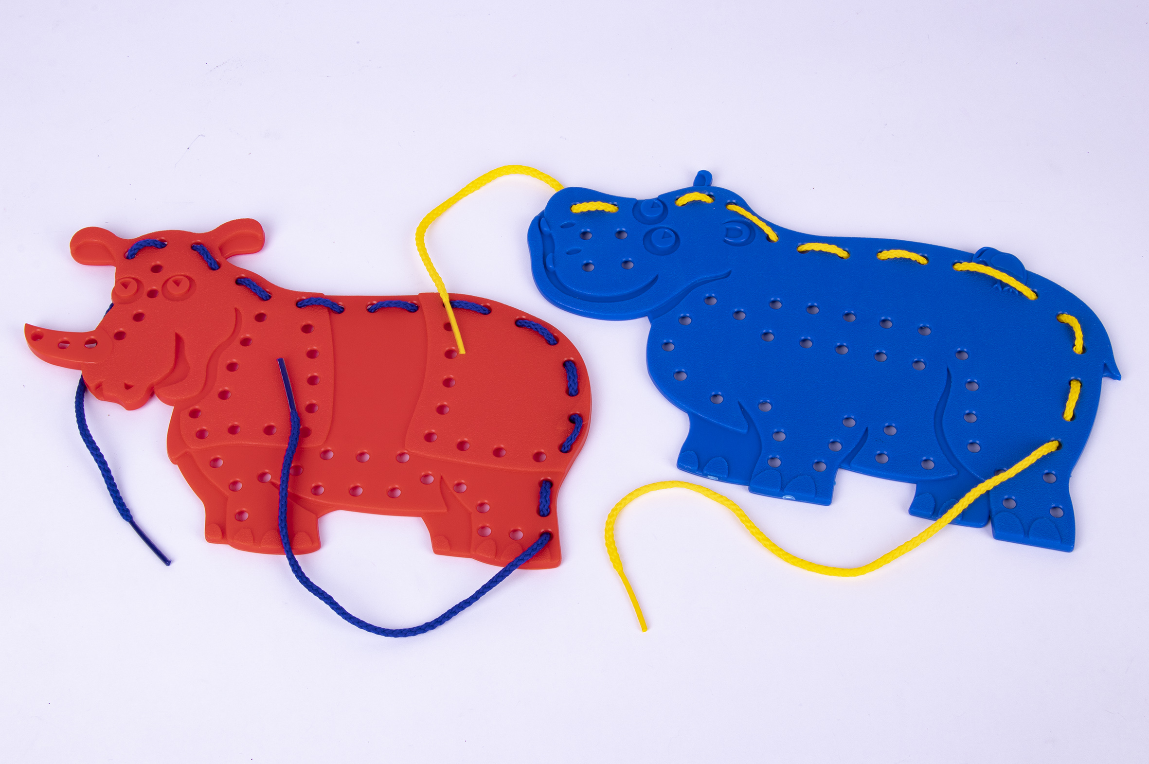 Jeux de laçage modèle Les Animaux. Chaque jeu comprend 6 animaux en plastique de couleurs variées avec des trous : éléphant, girafe, lion, singe, hippopotame et rhinocéros et 18 cordons colorés.