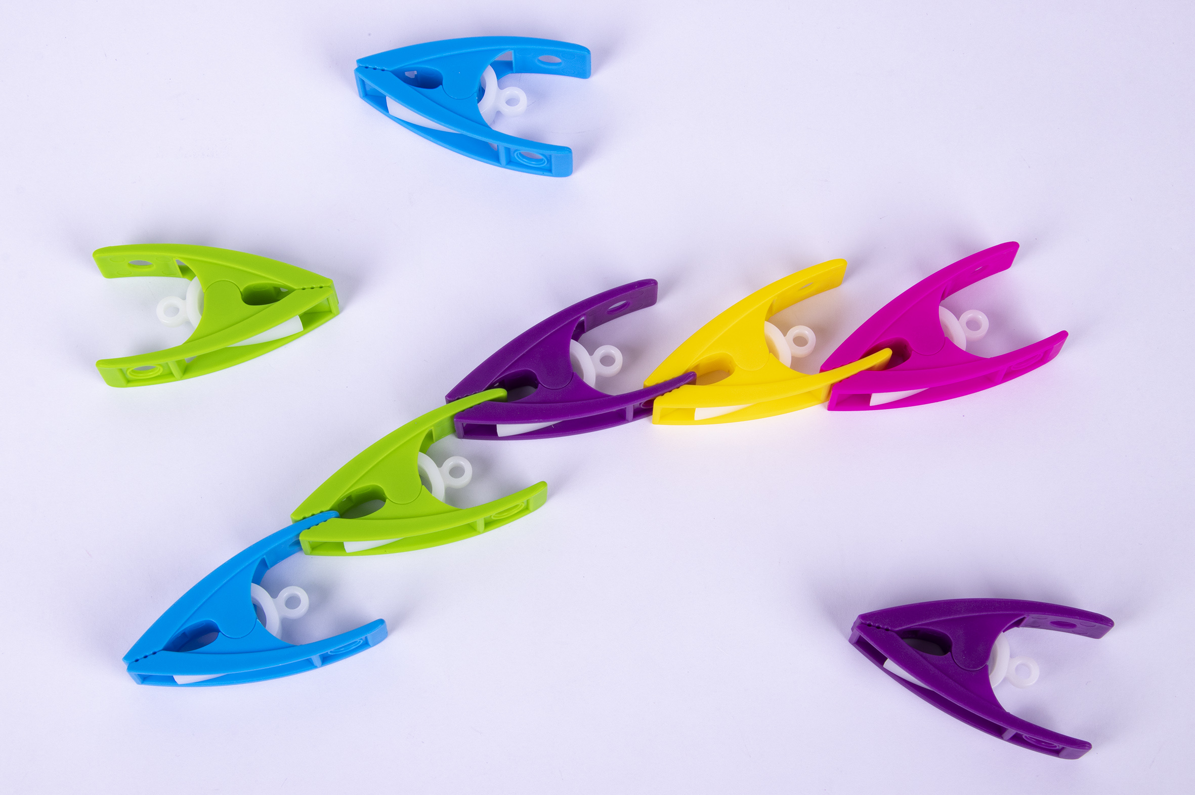 Paquet de 30 pinces en plastique de dimensions 60 x 33 x 15 mm en assortiment de couleurs : jaune, fuchsia, violet, vert et bleu.