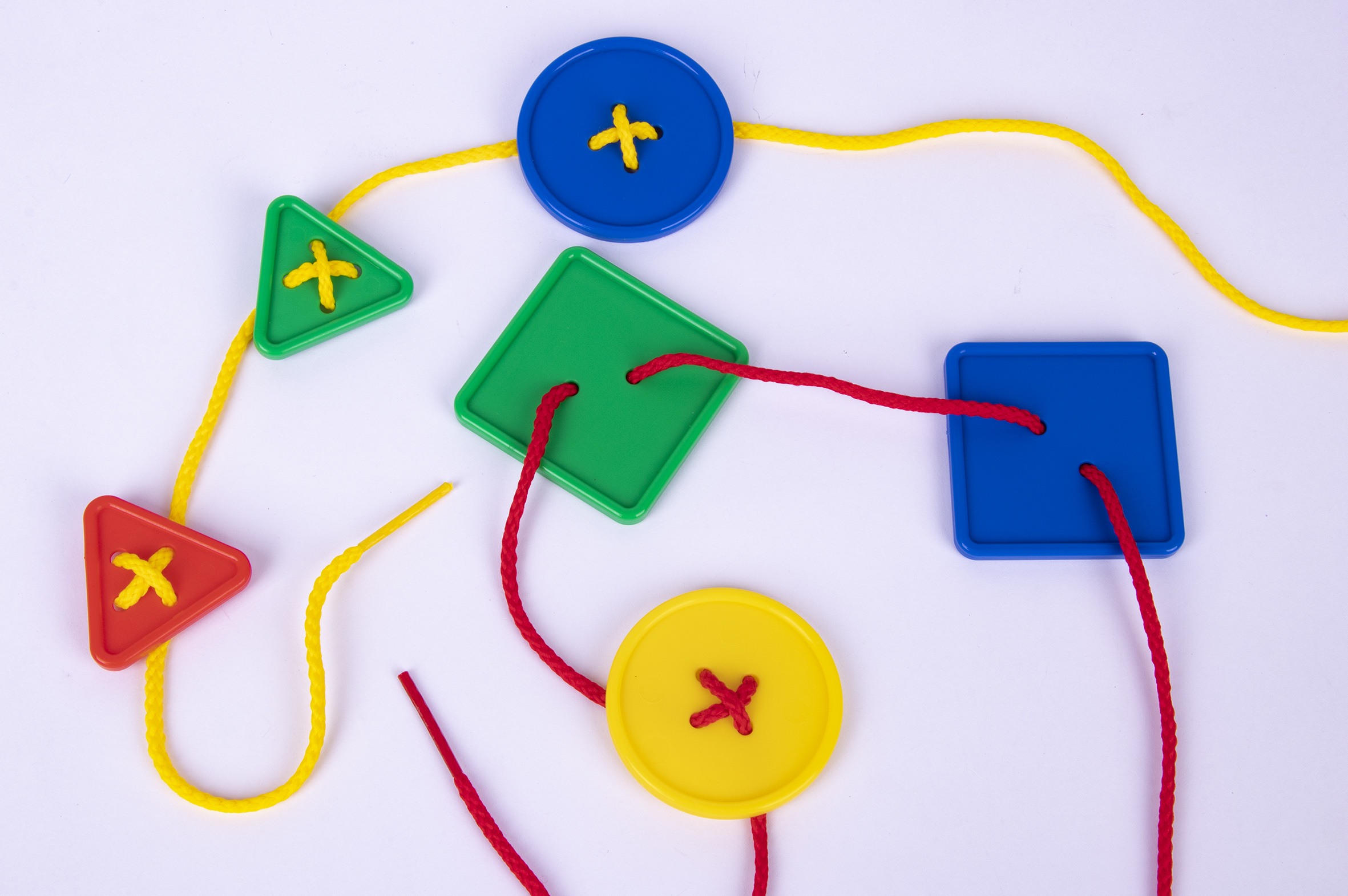 Jeu de boutons de laçage de différentes formes, dimensions et couleurs. Chaque sachet contient 4 cordons colorés et 48 boutons de laçage de différentes couleurs : jaune, rouge, vert et bleu. Boutons en trois formes géométriques : rond, triangle et carré ; 2 dimensions : 50 mm et 38 mm. Jeu à haute valeur didactique : permet de développer la psychomotricité fine et la coordination œil-main et stimule l'imagination et la créativité. Format MAXI, idéal pour l'école et les groupes. Recommandé pour les enfants à partir de 3 ans.