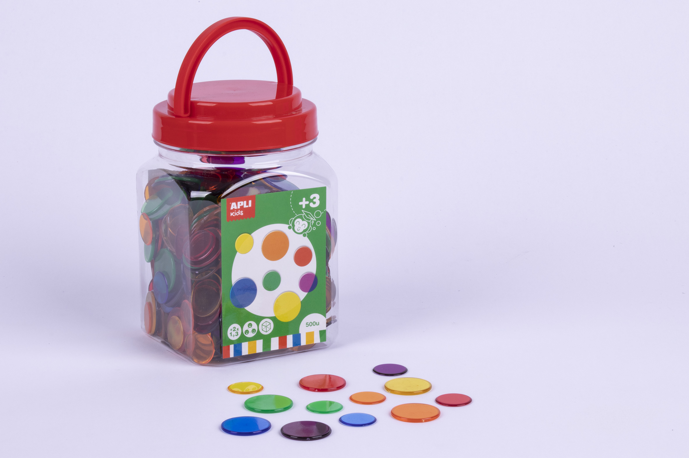 Boite de 500 jetons en plastique transparent de différentes couleurs : jaune, rouge, vert, bleu, orange et violet . Deux dimensions : 25 mm et 18 mm.