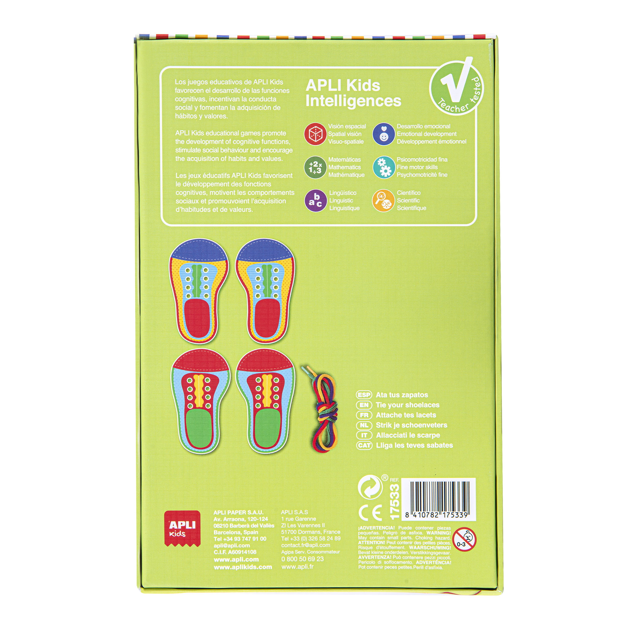Jeu pour apprendre à faire ses lacets. Chaque jeu comprend 4 bases (2 paires) de 95 x 165 mm en forme de chaussure et 4 lacets de différentes couleurs. Inclut des instructions.