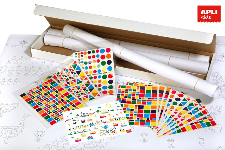 Chaque kit contient 4 affiches enroulées de dimensions 70 x 100 cm, 48 feuilles de gommettes enlevables
