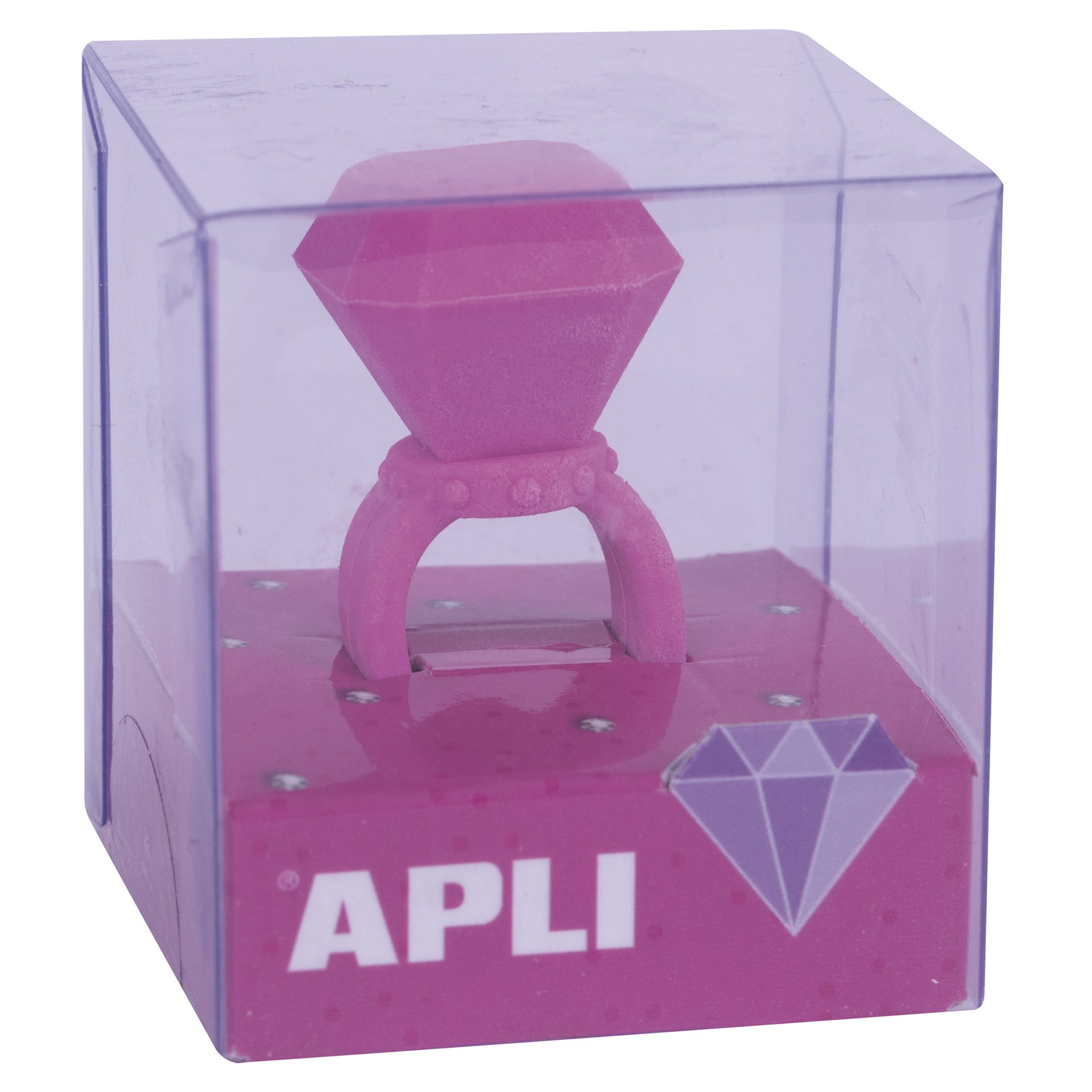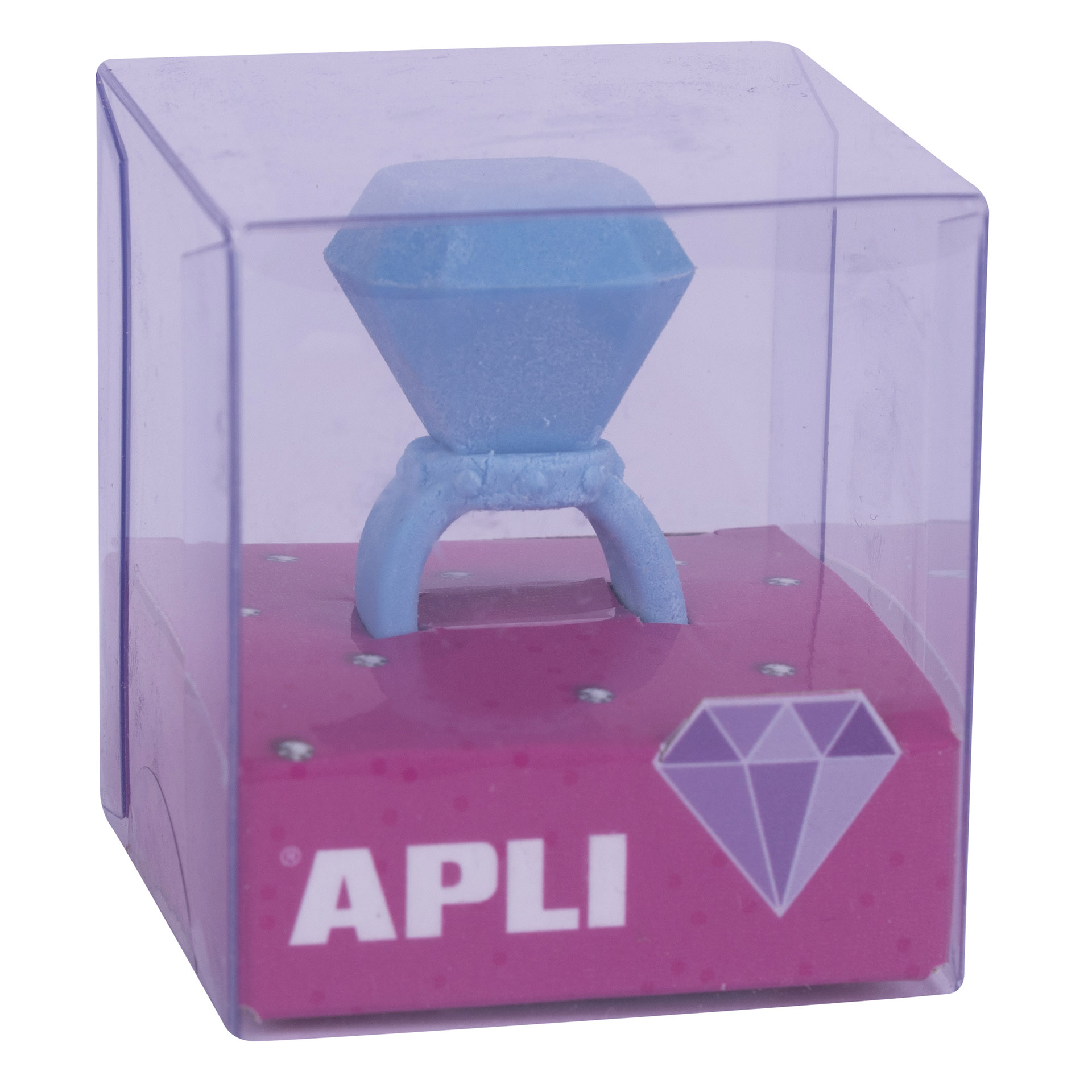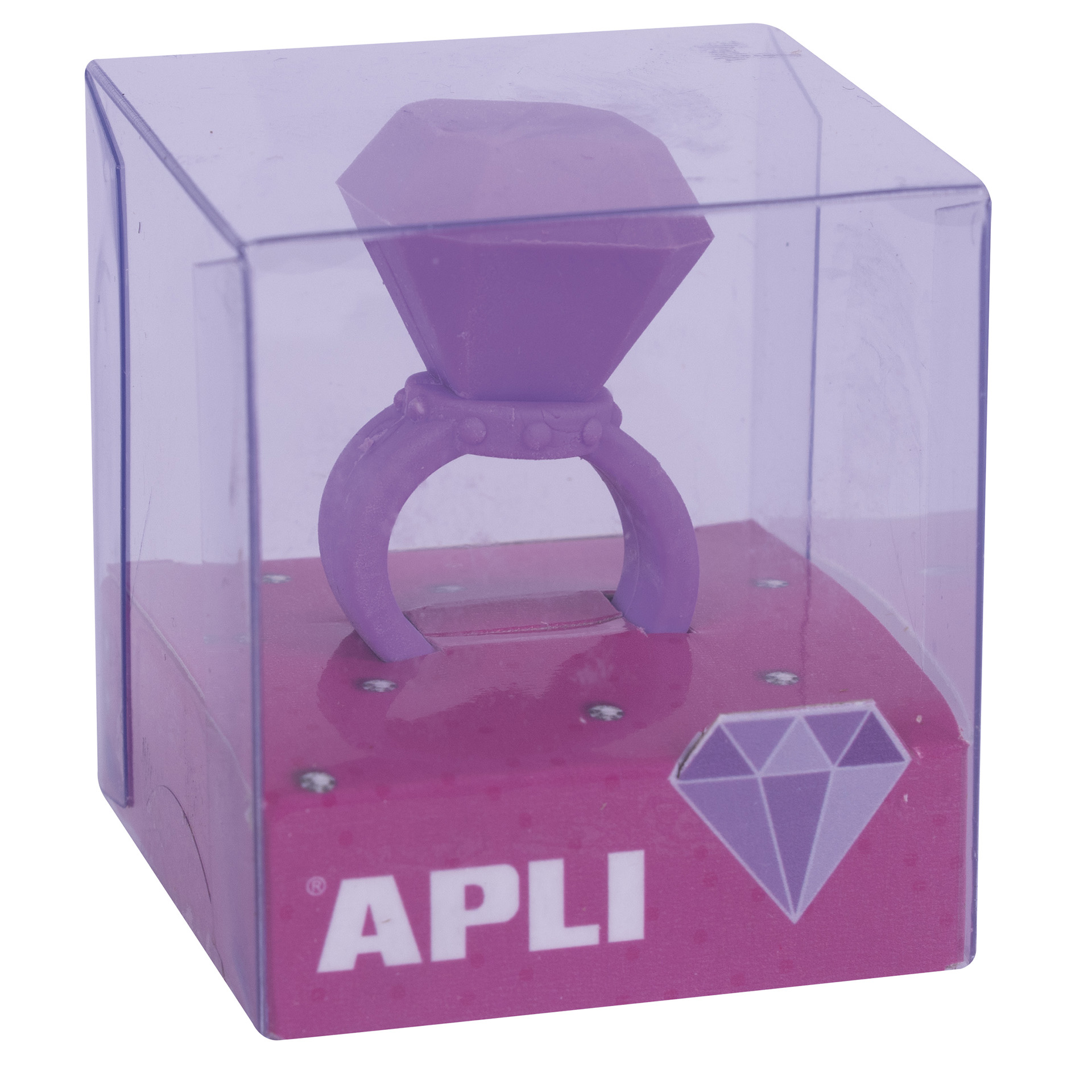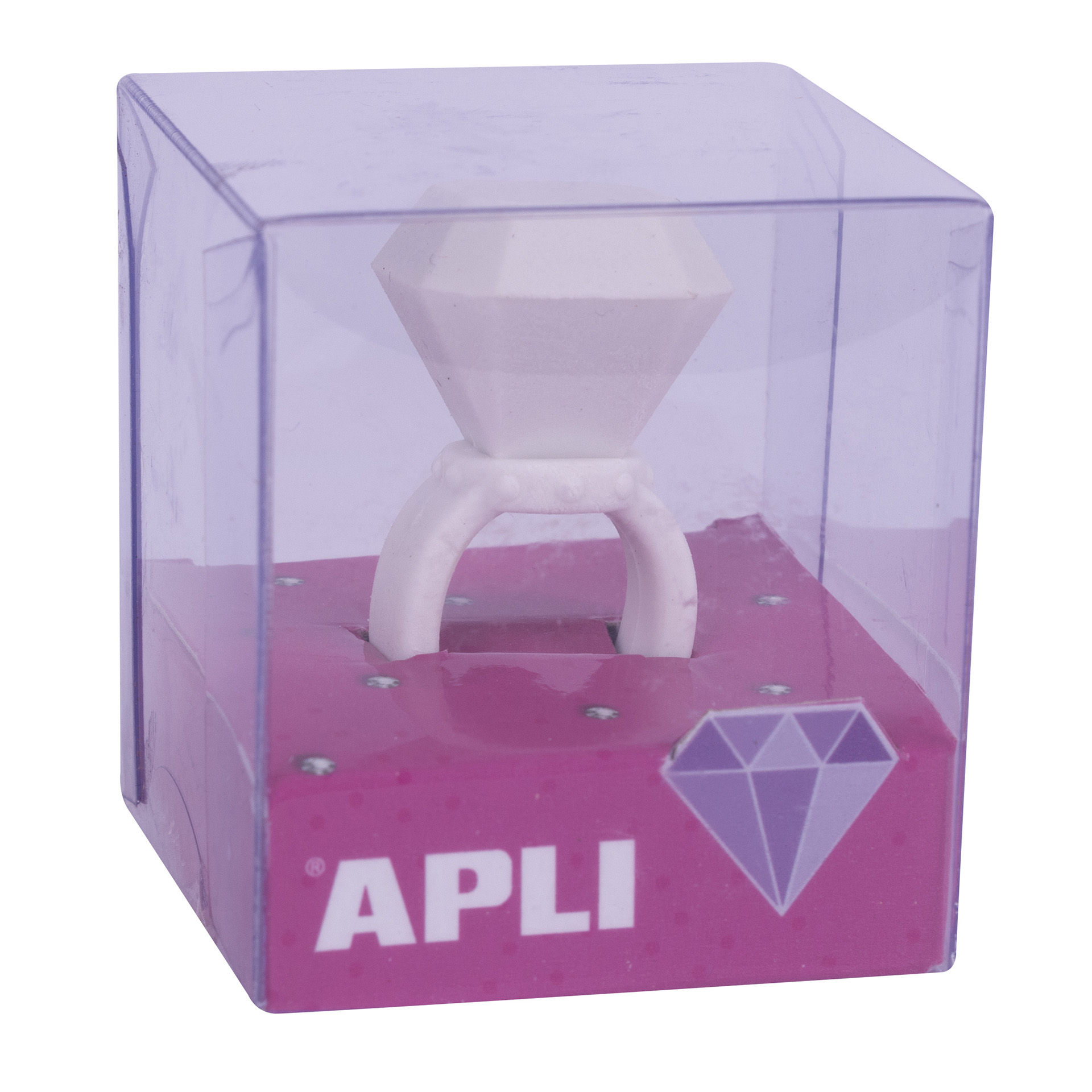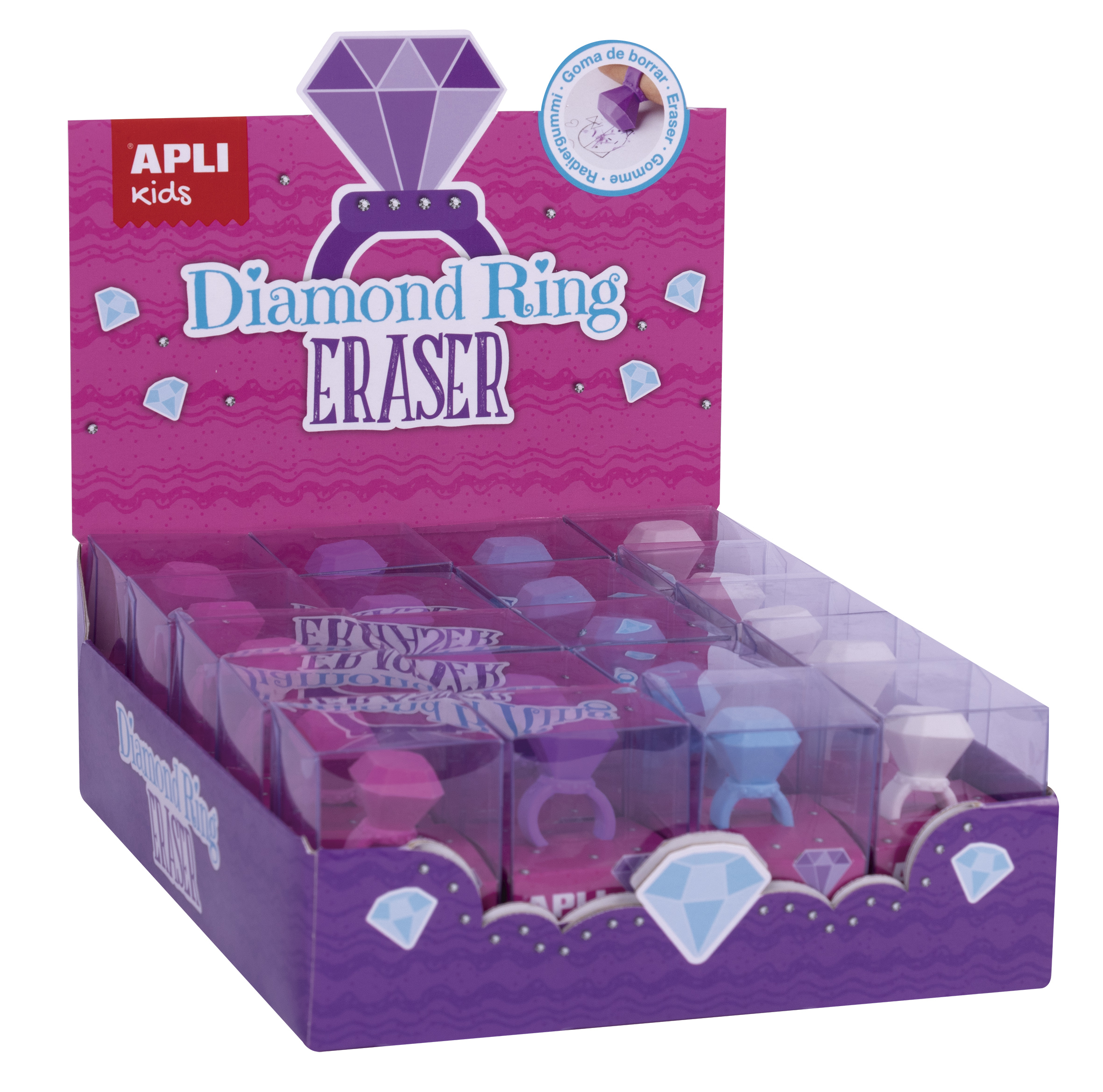 Gommes en forme de bague de diamant qui servent à la fois à effacer et à jouer. Présentoir comportant 20 gommes de différentes couleurs : rose, violet, bleu et blanc.