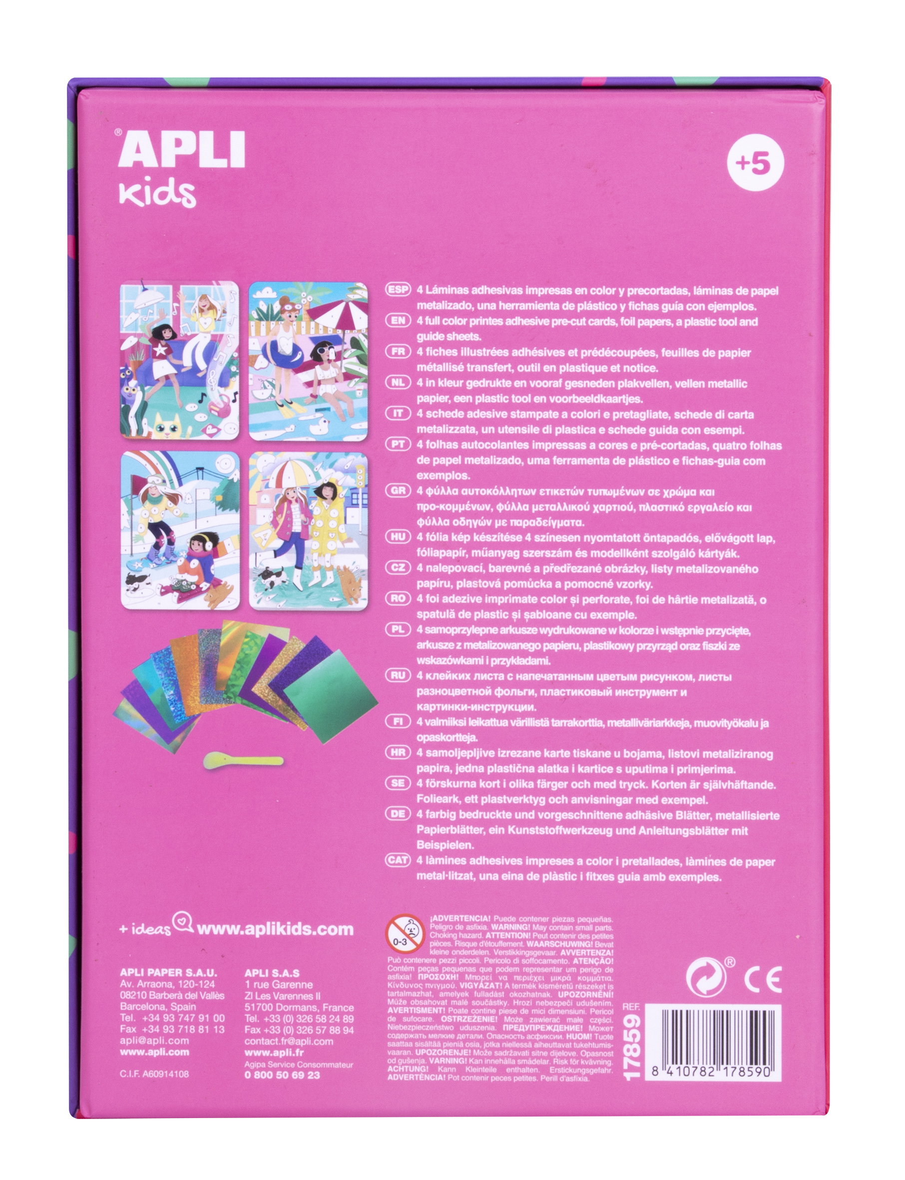 Le jeu inclut : 4 tableaux illustrés sur des planches adhésives et pré-découpées, 20 feuilles de papier transfert métallisé de 12 couleurs différentes, 1 outil en plastique et 1 notice explicative.