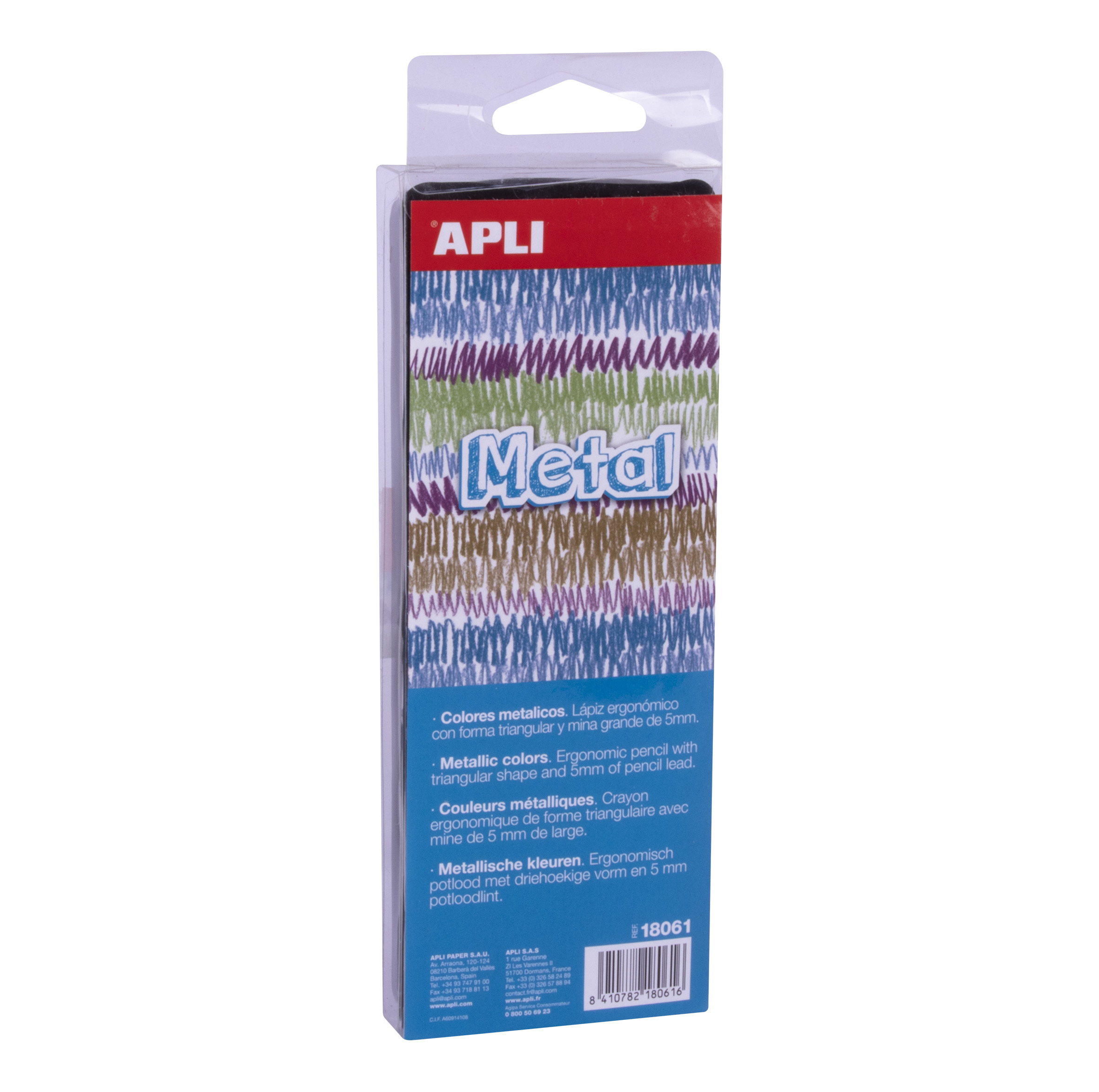 Crayons jumbo aux couleurs métallisées. Boîte individuelle perboardable contenant 6 crayon jumbo (5 mm) de couleurs assorties :or, argent, orange, bleu, vert et rose dans des tons fluorescents