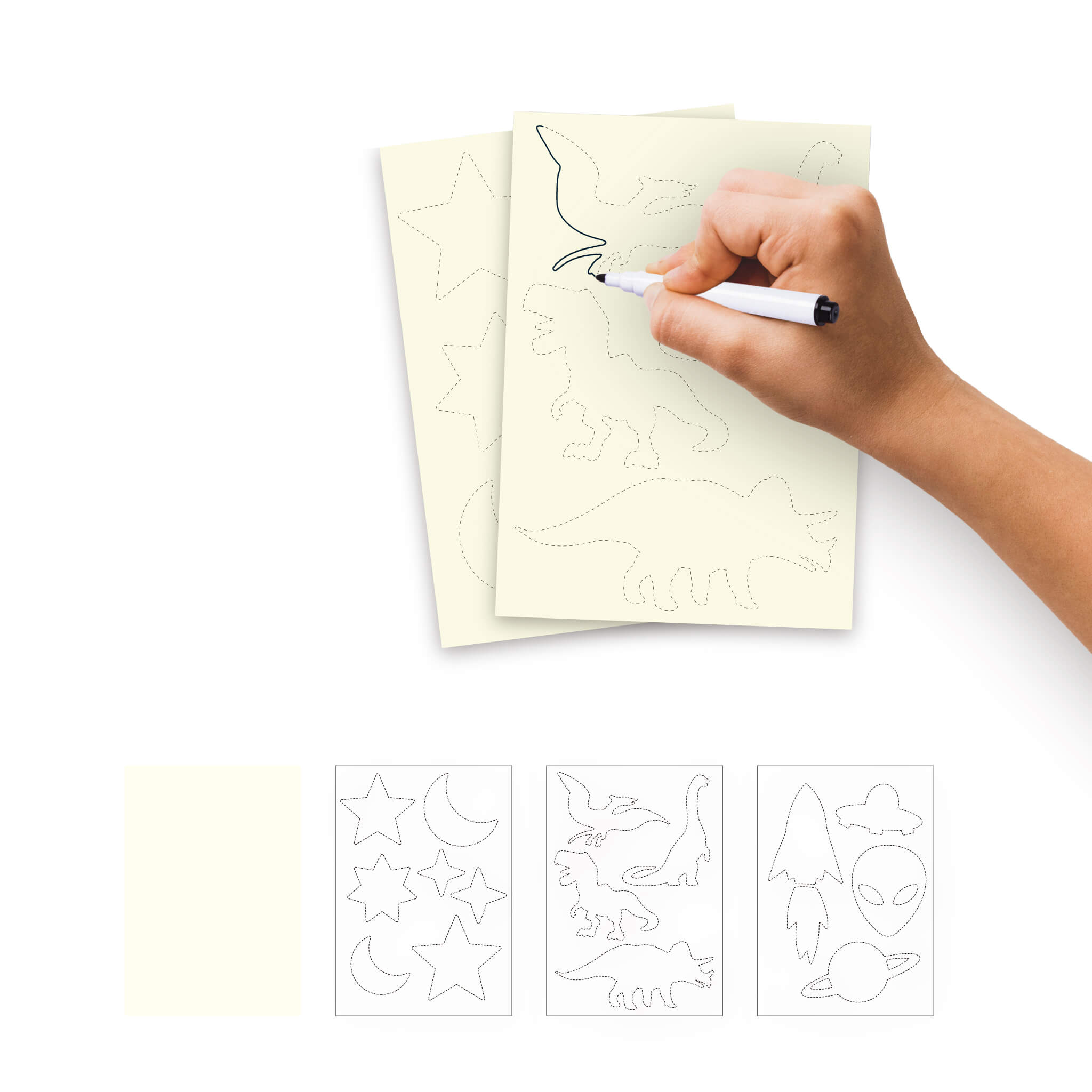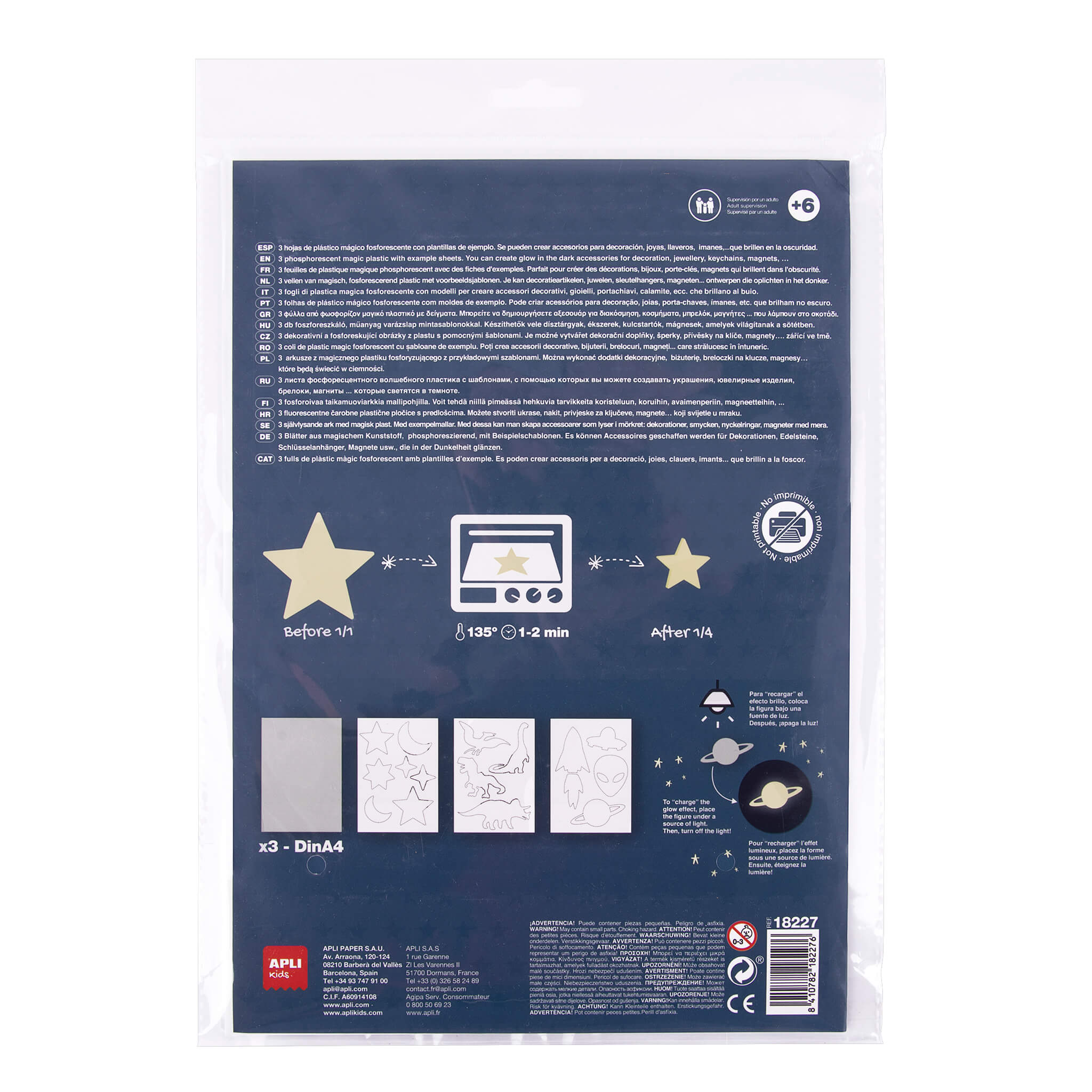 Plastique magique au format A4 avec finition phosphorescente, brille dans le noir. Chaque pack comprend 3 feuilles de 210 x 297 mm.
