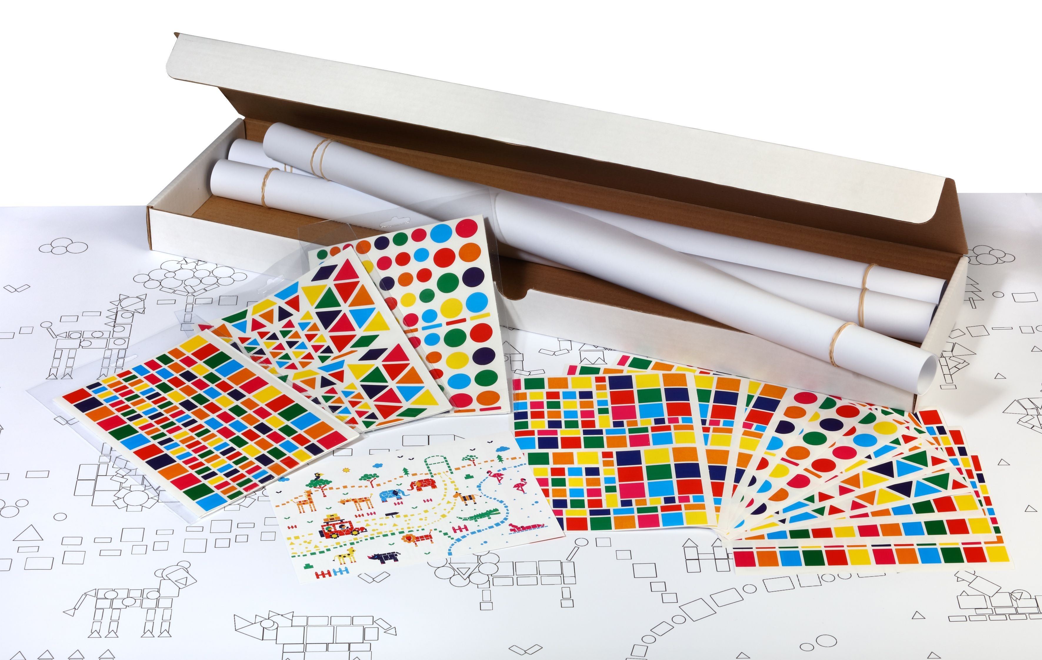 Chaque kit contient 4 affiches enroulées de dimensions 70 x 100 cm, 48 feuilles de gommettes enlevables