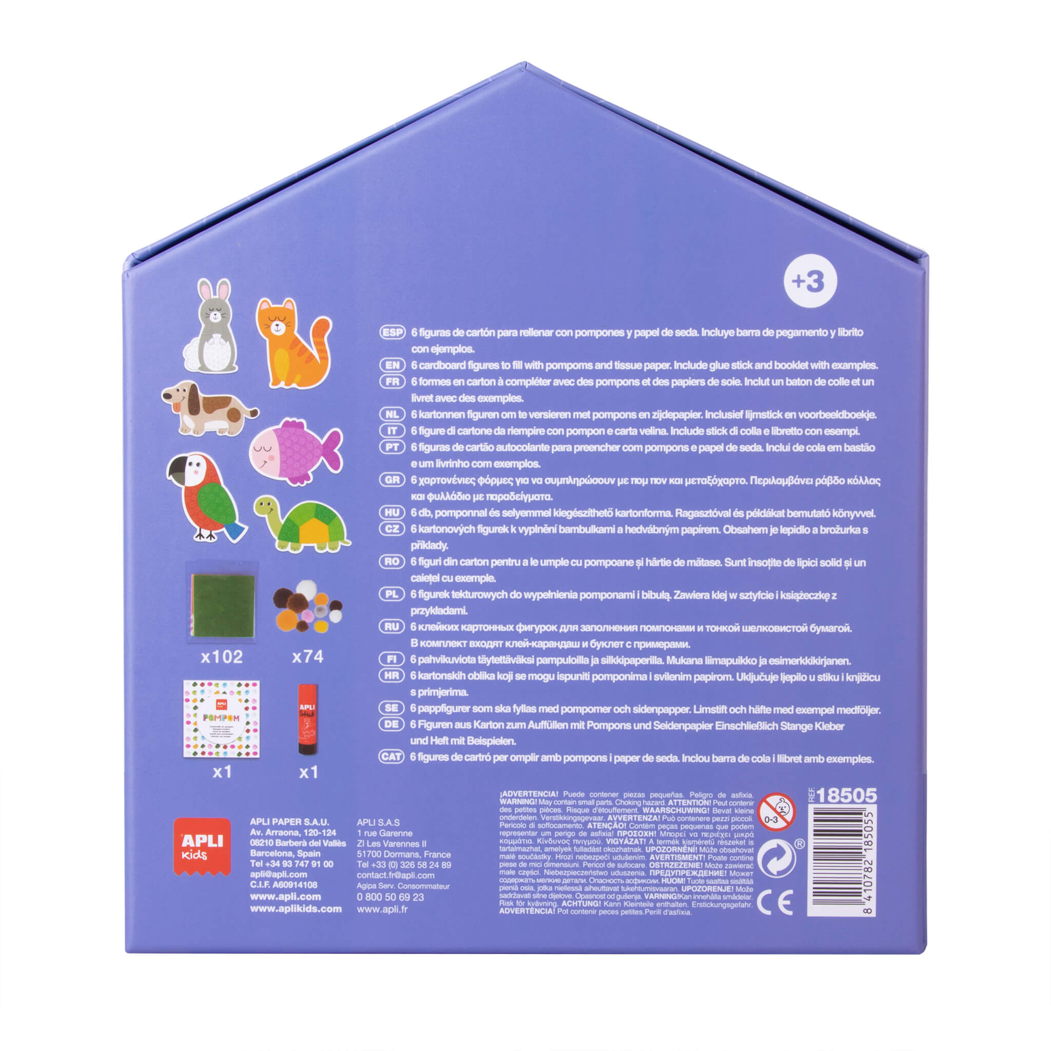 Il comprend 6 fiches XL illustrées et prédécoupées en forme de divers animaux de compagnie, 102 feuilles de papier de soie et 74 pompons de différentes couleurs et dimensions, 1 bâton de colle 20gr, 1 livret avec des instructions et des exemples sur la façon de réaliser l'activité.