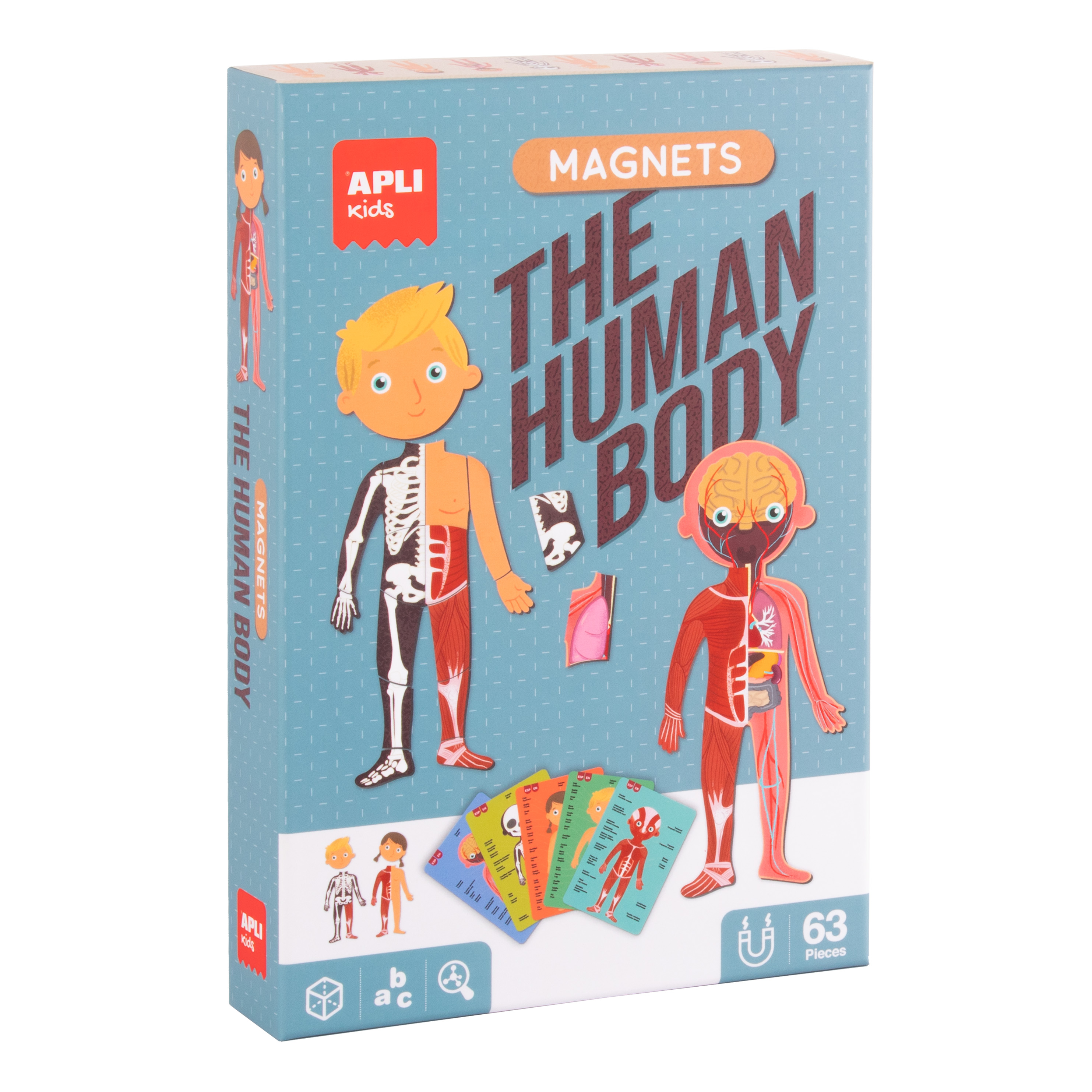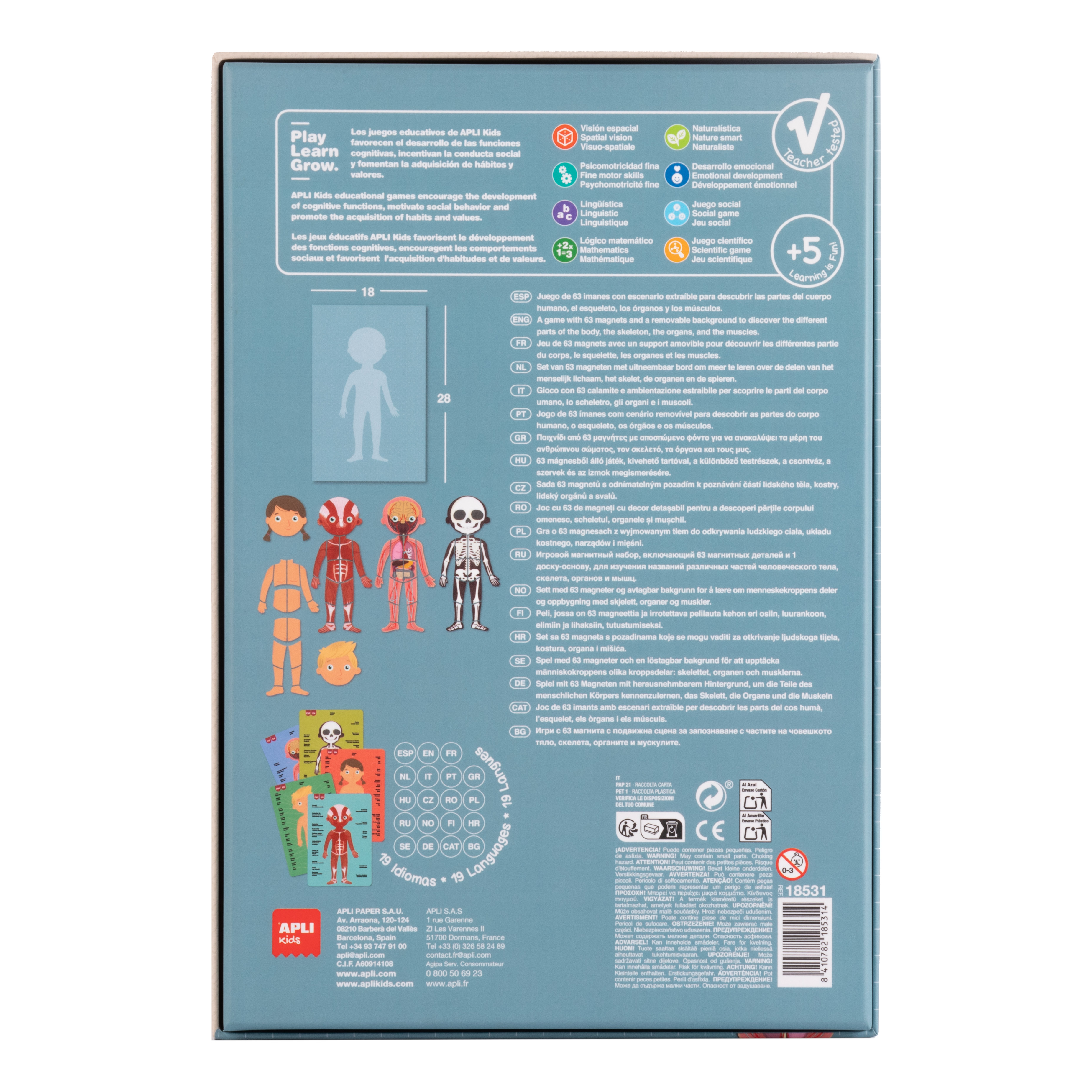 Chaque ensemble contient : 1 scène aimantée de 28 x 18 cm facilement positionnable dans l'encode de la boîte et 63 magnets avec les différentes parties du corps humain, le squelette, les organes et les muscles. Comprend 15 fiches avec des informations détaillées dans 12 langues différentes.