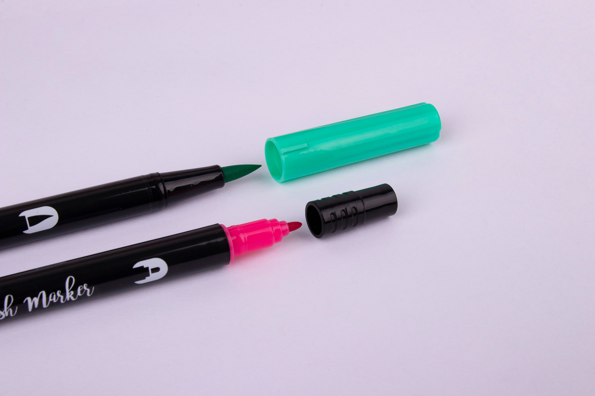 Assortiment de 6 feutres aquarelles Brush Marker dans les tons pastels à double pointe : une pointe de pinceau en nylon souple et flexible de 1-4 mm, qui vous permet de combiner facilement des traits fins et épais. De l'autre, une pointe ronde de précision de 1 mm pour dessiner vos créations.