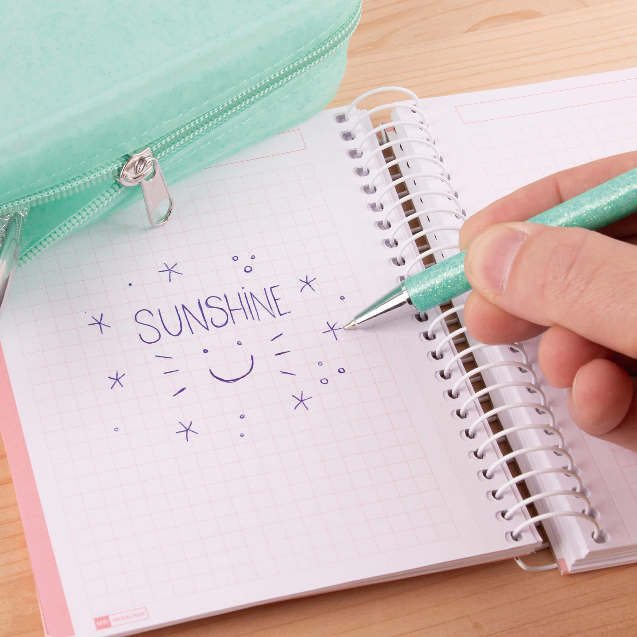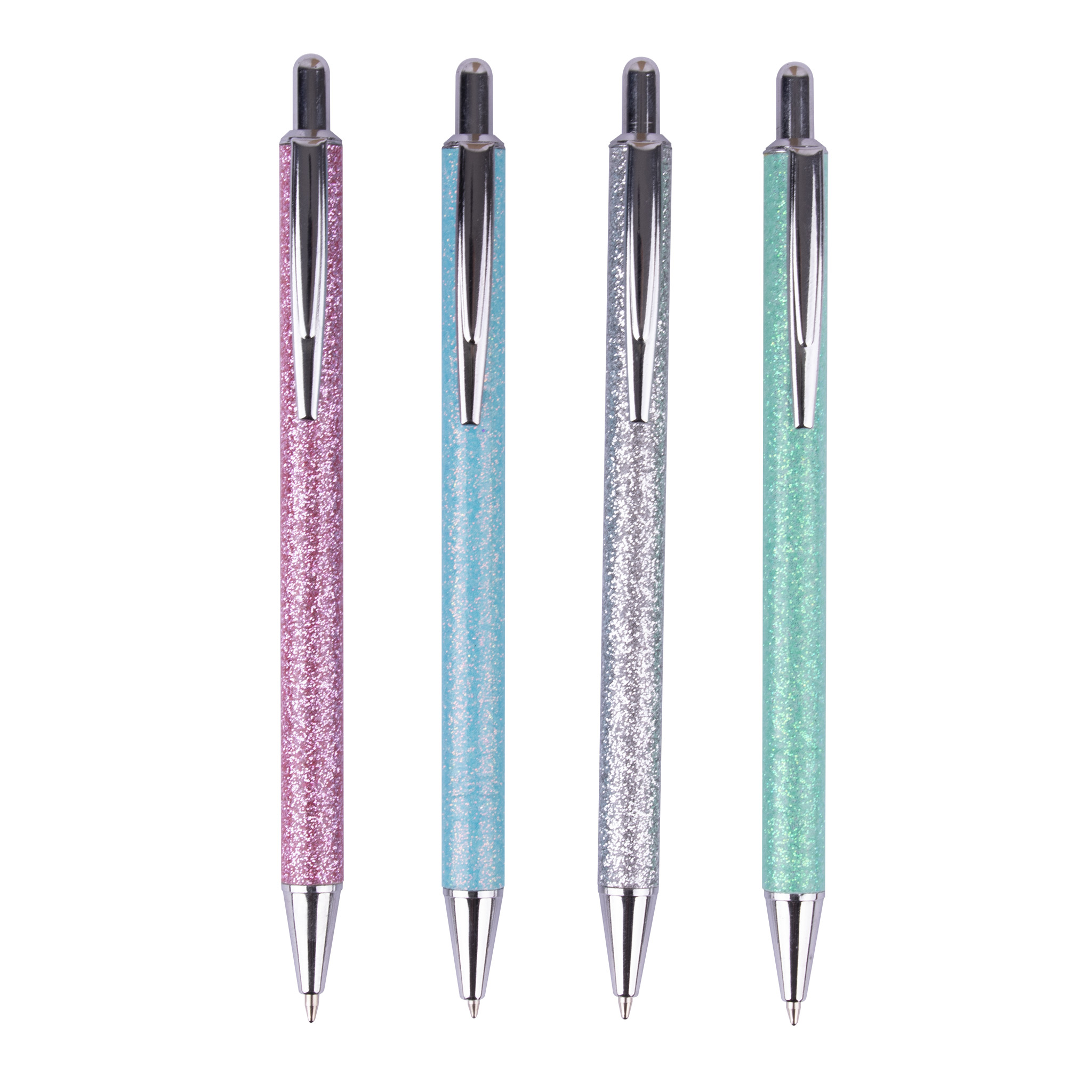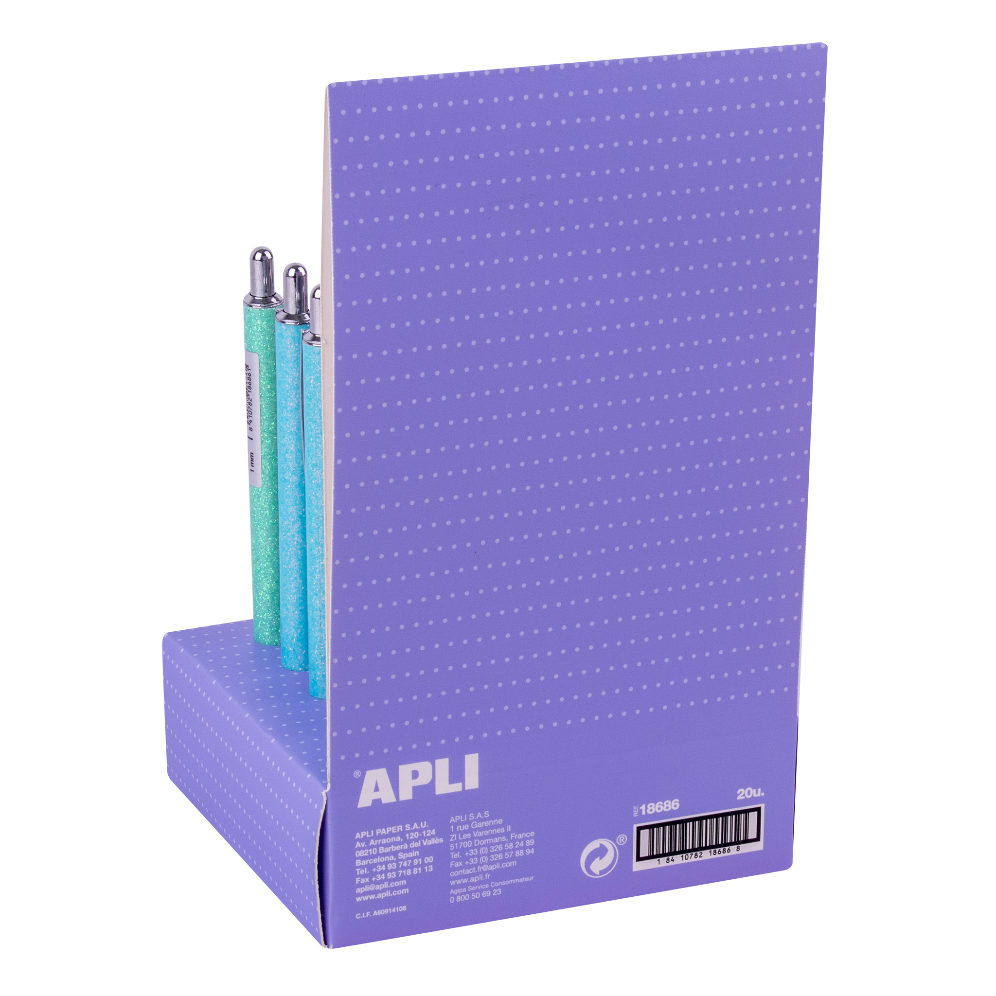 Stylos à bille avec encre à l'huile et pointe de 1 mm en bleu. Chaque présentoir contient 20 stylos, 5 unités par couleur : rose, bleu, argent et turquoise pailleté.
