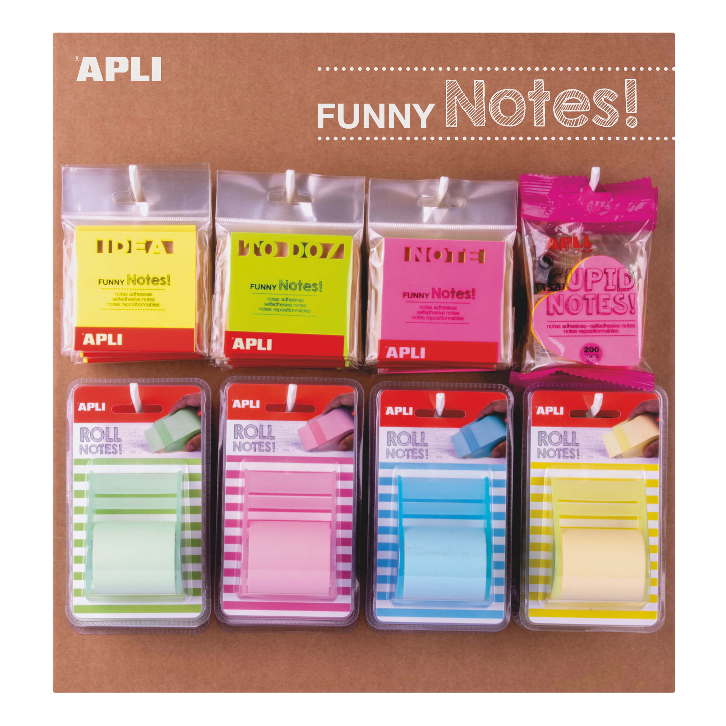 Présentoir d'assortiment de notes amusantes. Comprend 8 crochets pour accrocher les références de notes adhésives. Contient 8 unités de notes en rouleau (deux par couleur), 3 unités de notes autocollantes en forme de cœur et 24 unités de notes autocollantes avec message (8 par motif).