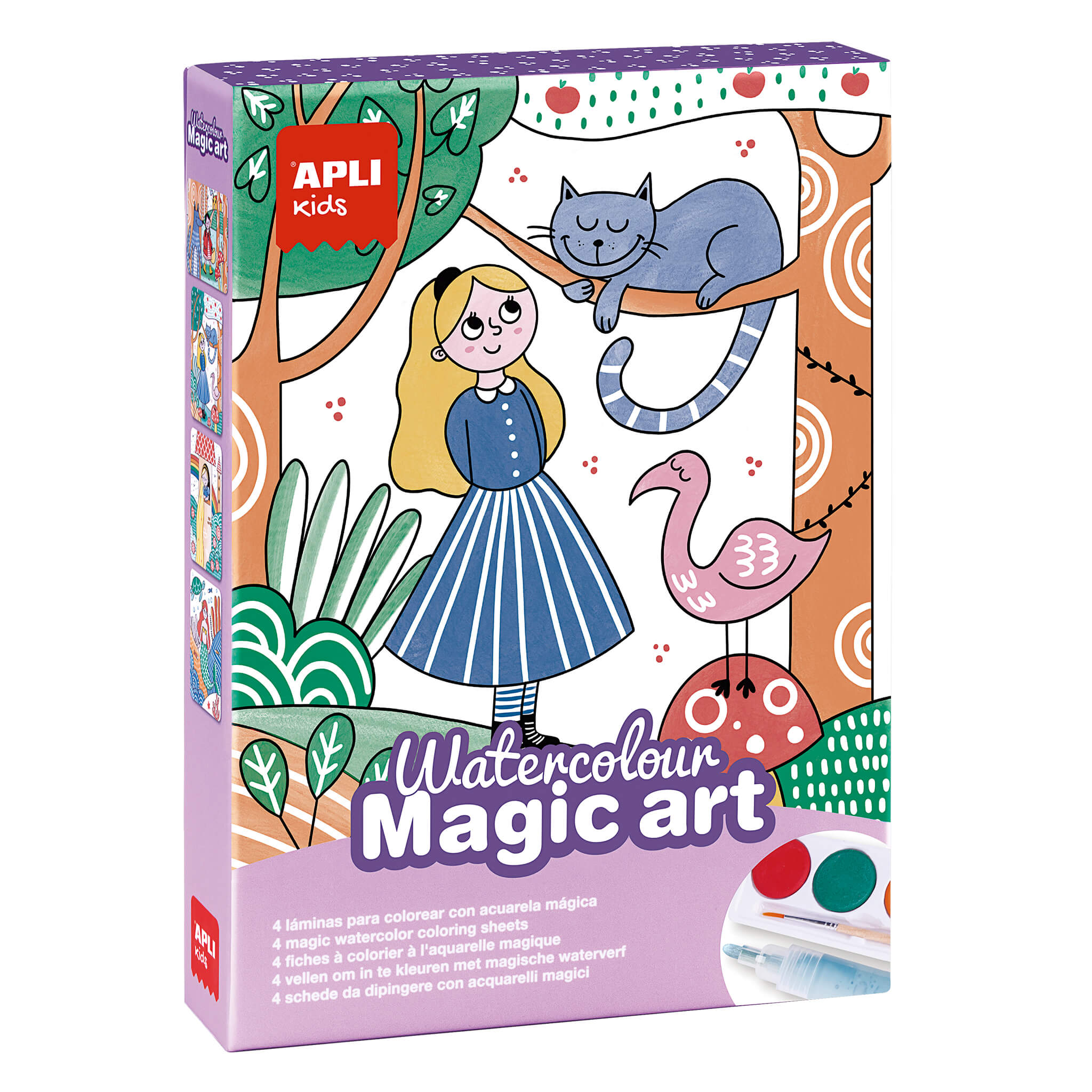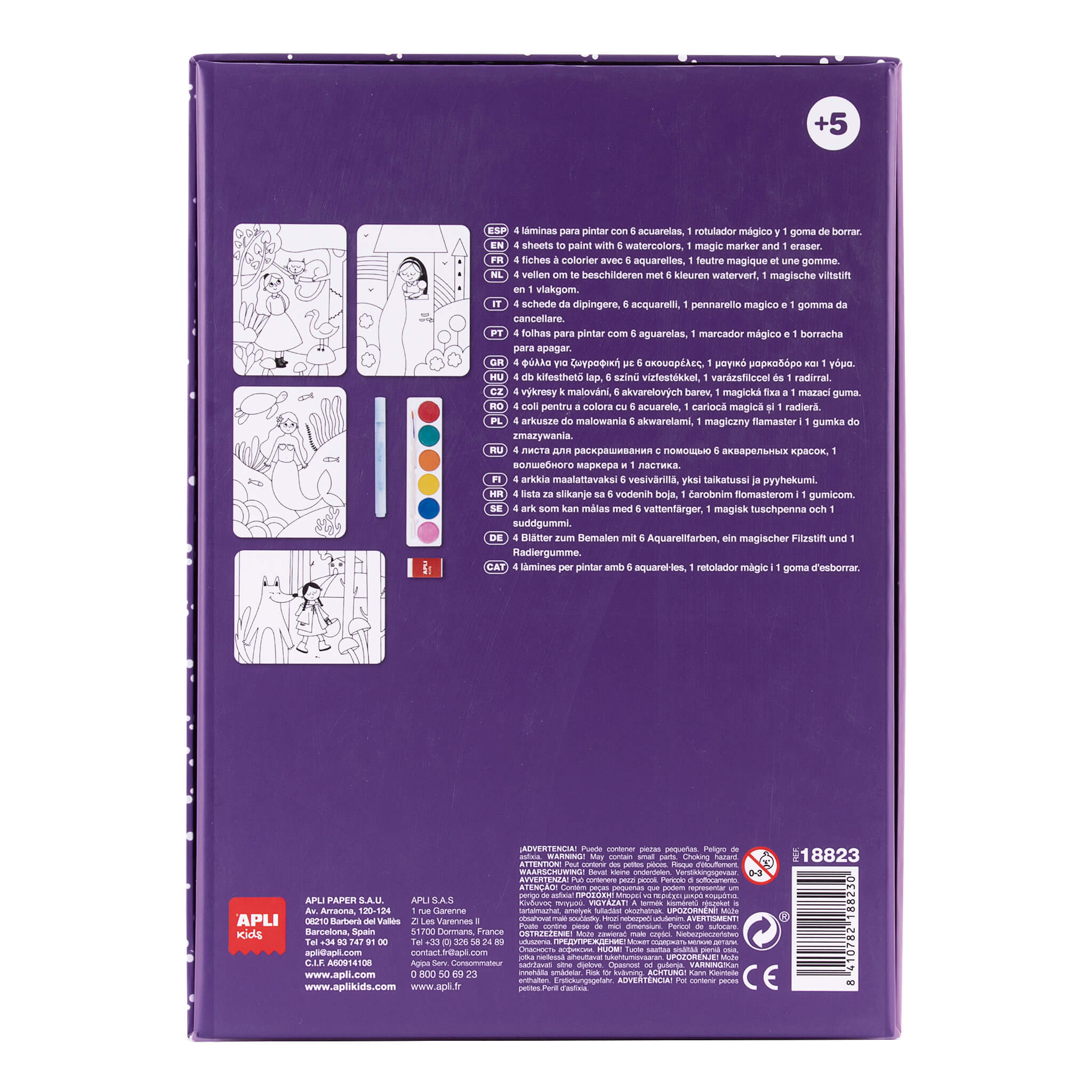 Activité de peinture à l'aquarelle. Ce qui fait la différence, c'est l'effet magique obtenu avec le marqueur, il permet de créer des motifs et des formes pour peindre les feuilles de manière plus créative. Obtenez un résultat comme un artiste ! Le set de coloriage magique comprend : 4 feuilles illustrées à peindre à l'aquarelle,6 pastilles aquarelles de différentes couleurs, 1 pinceau,1 gomme et 1 feutre magique. Cartes guides avec exemples. Illustrations de feuilles avec des dessins d'histoires populaires pour enfants. Recommandé pour les enfants à partir de 5 ans.