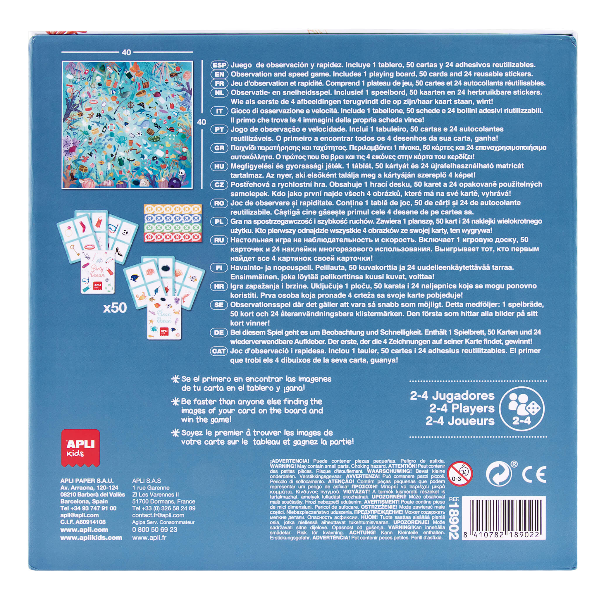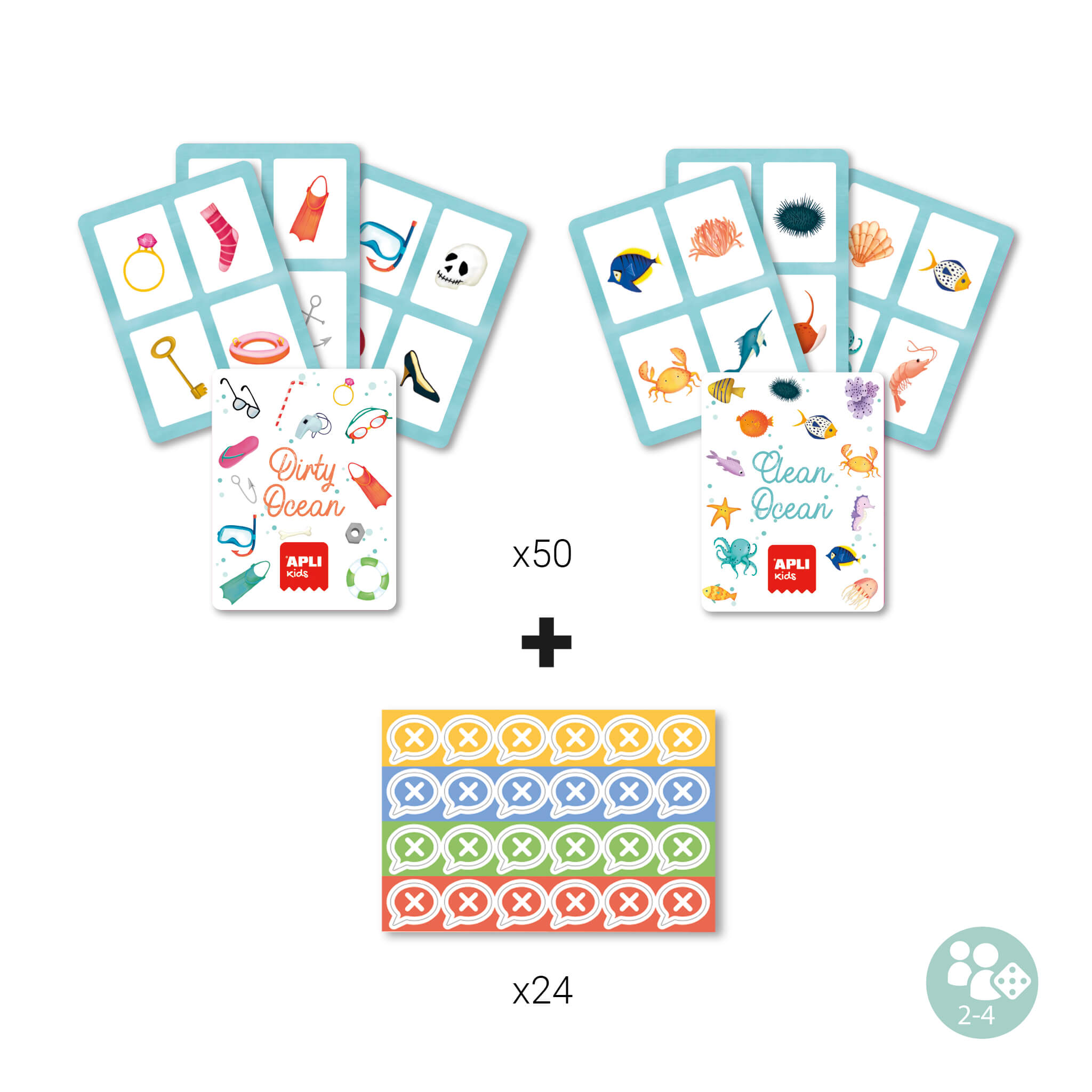 Le jeu comprend des cartes avec des images d'objets qui représentent les déchets que nous trouvons dans l'océan, les animaux et les plantes qui vivent sous l'eau, afin que les enfants découvrent l'environnement pendant qu'ils jouent.