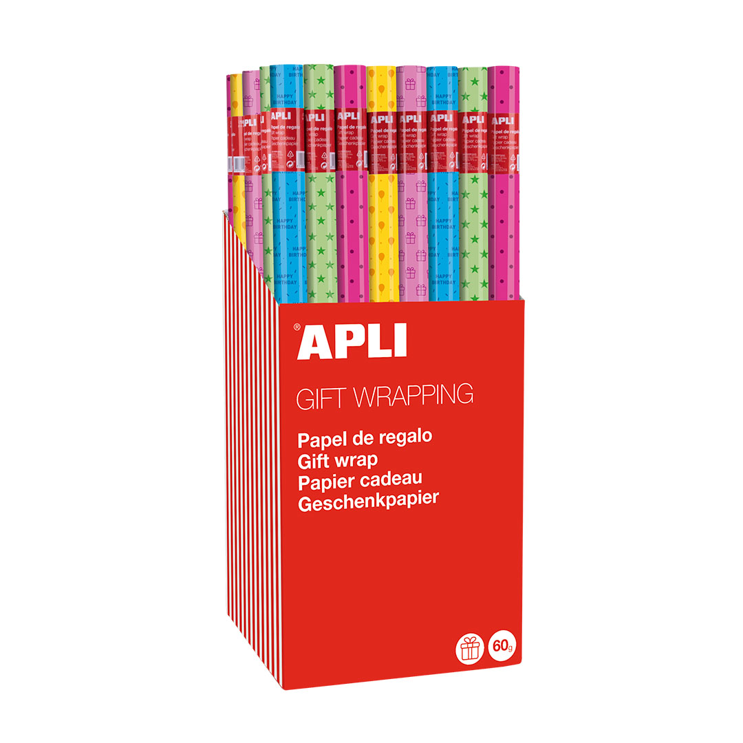 Présentoir de rouleaux de papier cadeaux modèle Kraft Fun. Chaque présentoir contient 55 rouleaux de 5 motifs différents (11 rouleaux par motif). Chaque rouleau mesure 0,7 x 2 m. Papier cadeau de haute qualité non transparent avec des designs modernes colorés. Le papier idéal pour toutes les occasions.