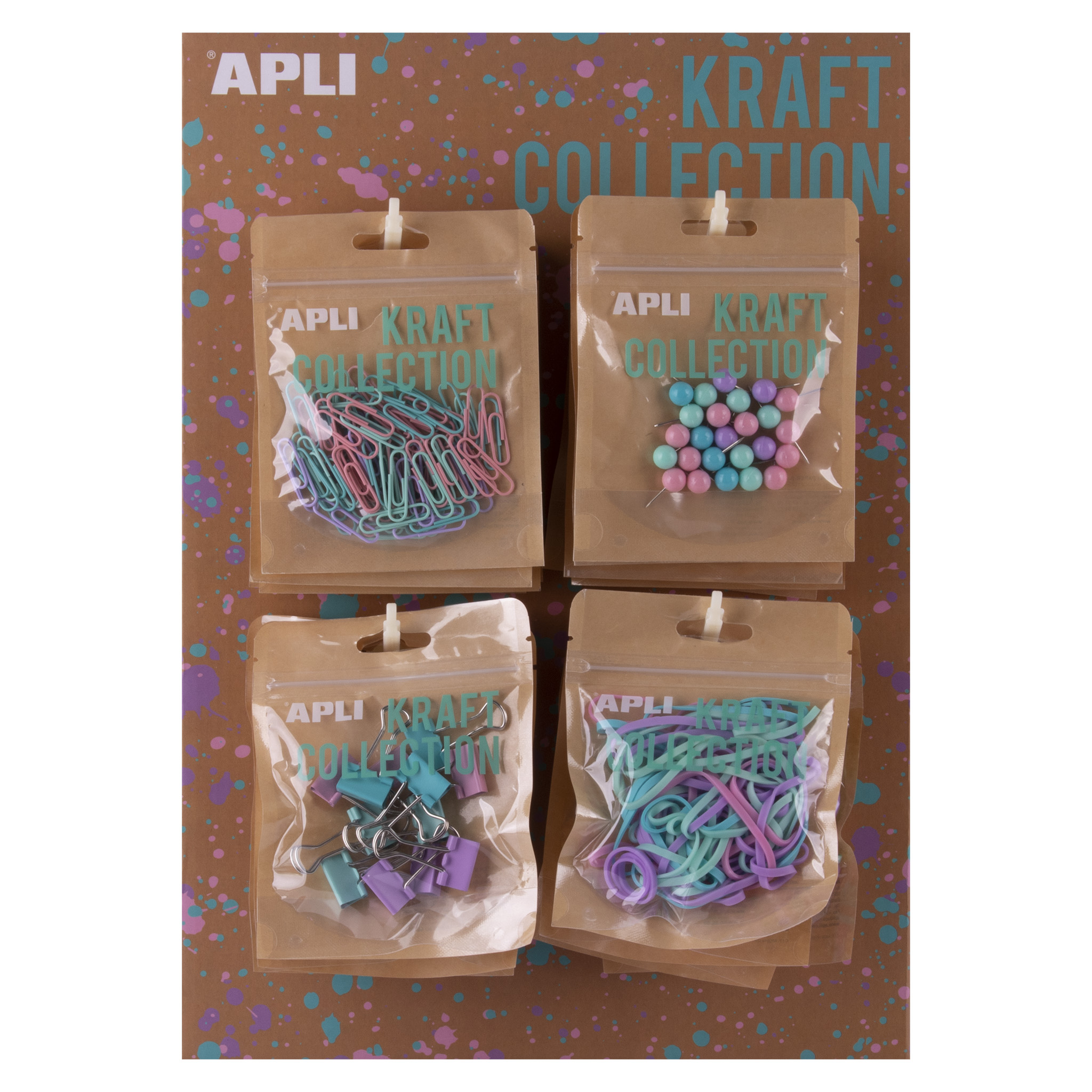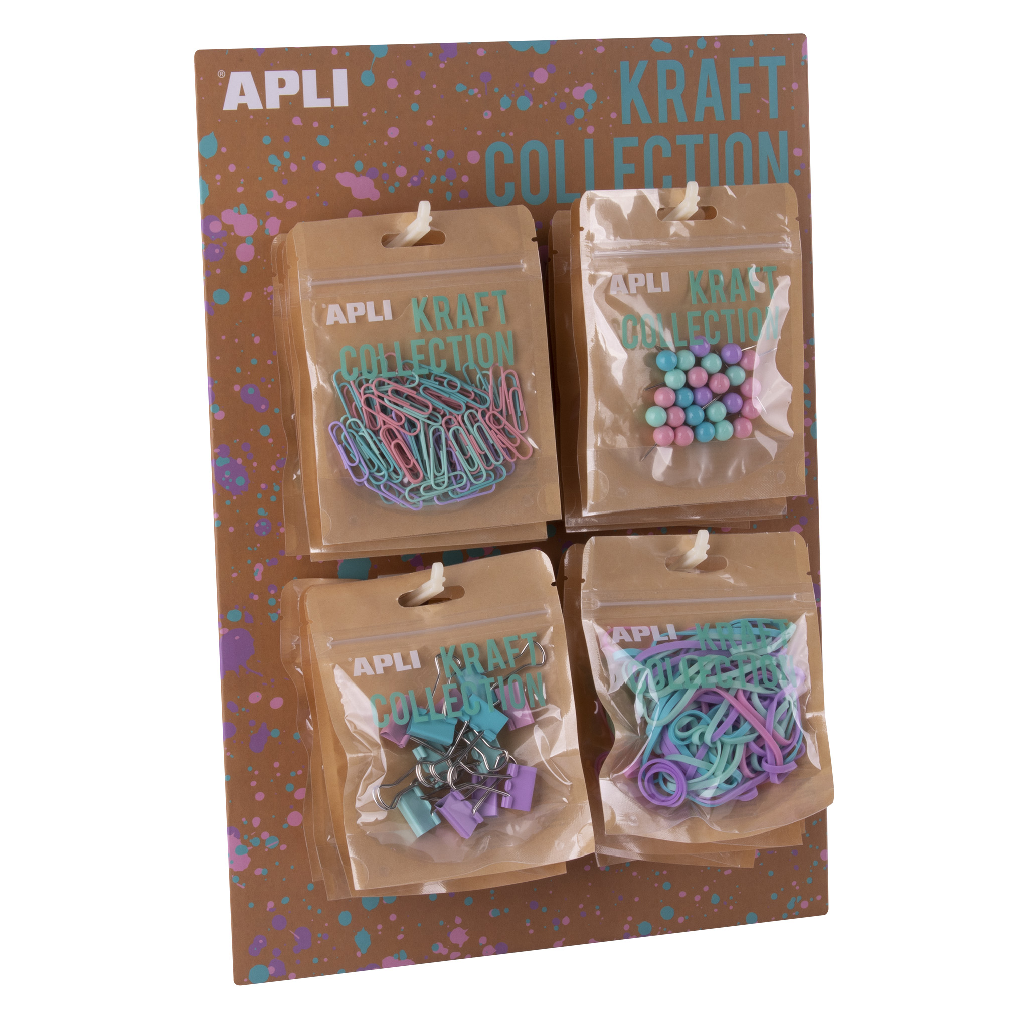 Présentoir de la gamme Kraft Collection avec des produits de base pour le bureau et la maison. Tous les produits sont présentés dans des couleurs assorties pastel : rose, lilas, turquoise et bleu. Un design moderne et accrocheur pour garder votre bureau à la mode.