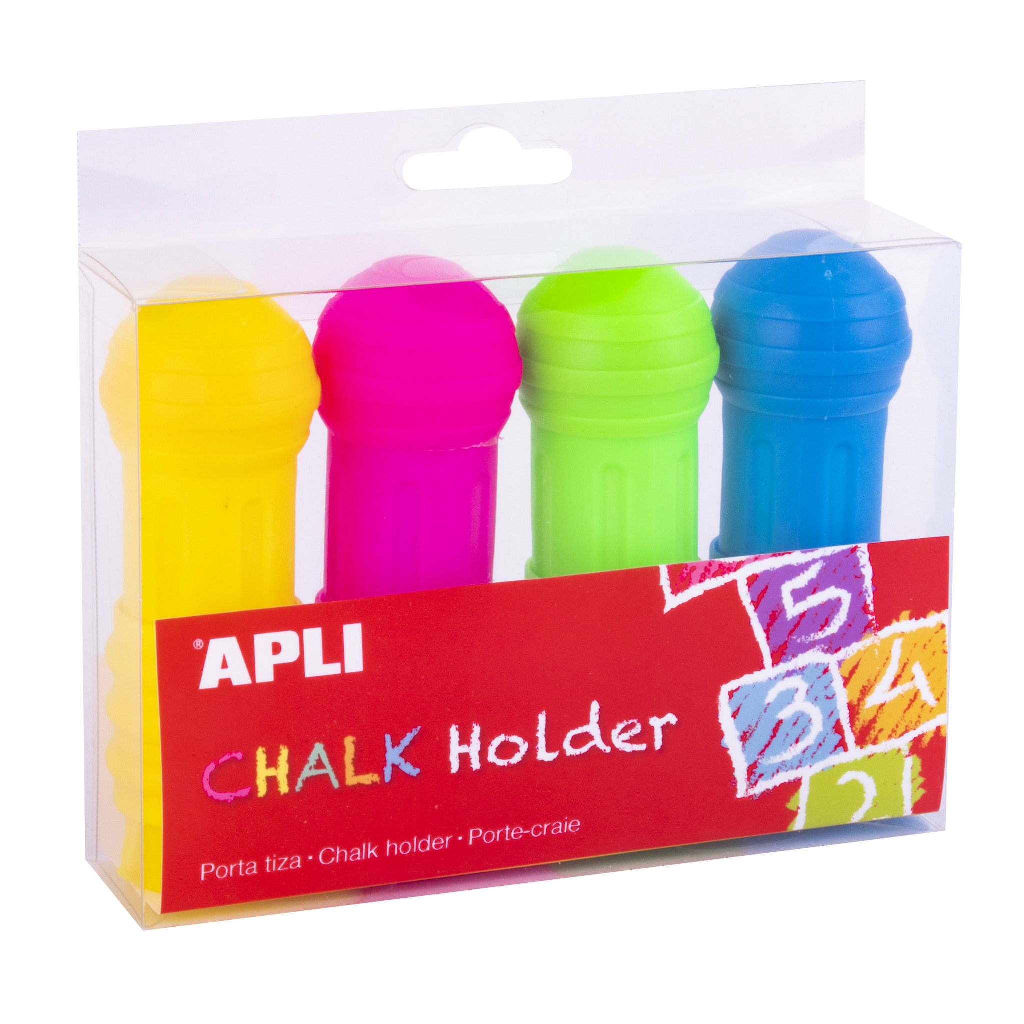 Pack de porte-craie pour contenir de la craie jumbo de 25 mm de diamètre et éviter la casse. Le pack comprend 4 porte-craies de différentes couleurs : jaune, fuchsia, vert et bleu. Ils sont parfaits pour ajuster la longueur de la craie, avoir une plus grande précision et ne pas se salir les mains.