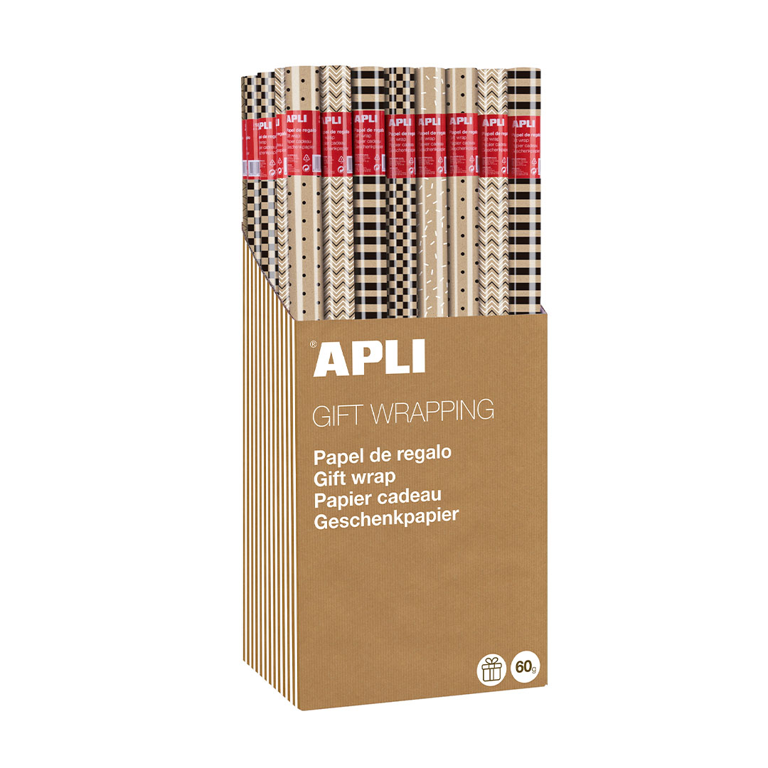 Présentoir de rouleaux de papier cadeau modèle Black&White. Chaque présentoir contient 55 rouleaux de 5 motifs assortis (11 rouleaux par motif). Chaque rouleau mesure 0,7 x 2 m.