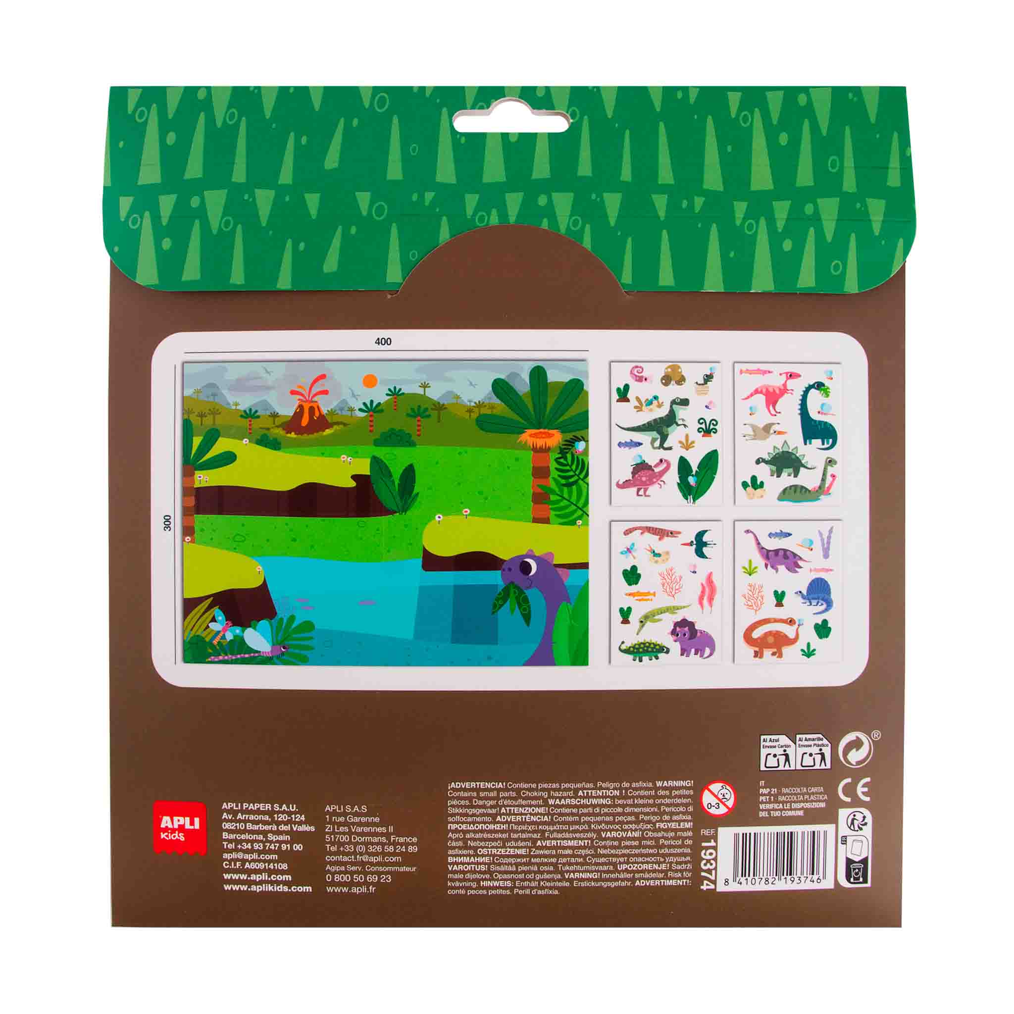 Pochette de stickers & scène sur le thème des dinosaures