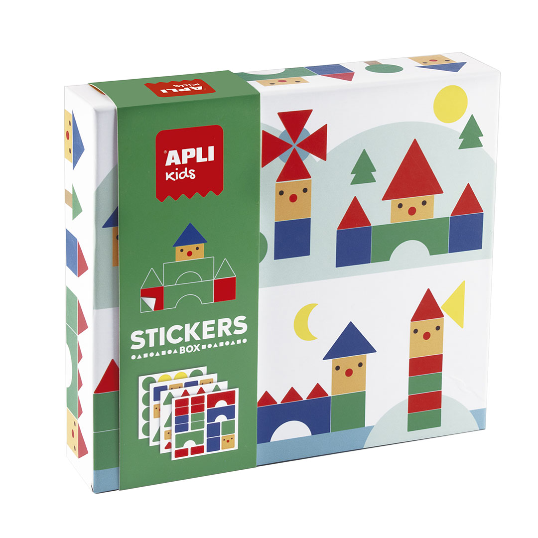 Jeu de gommettes géométriques sur le thème Les villages dans une boîte en carton.
