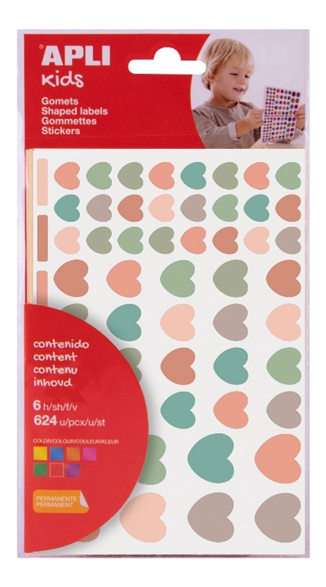 Pochette de gommettes en forme de coeur avec un adhésif enlevable au couleurs Vintage : rose pastel, vert pastel, bleu pastel, vieux rose, vert, taupe. Trois dimensions assorties. Chaque pochette contient 6 feuilles avec des gommettes de dimensions assorties, chaque feuille contient 104 gommettes, pour un total de 624 gommettes par sachet. Un produit indispensable dans tous les foyers et à l’école. Avant d’apprendre à se servir des crayons et de la peinture, les enfants peuvent découvrir le monde des couleurs et des formes grâce à ces gommettes.