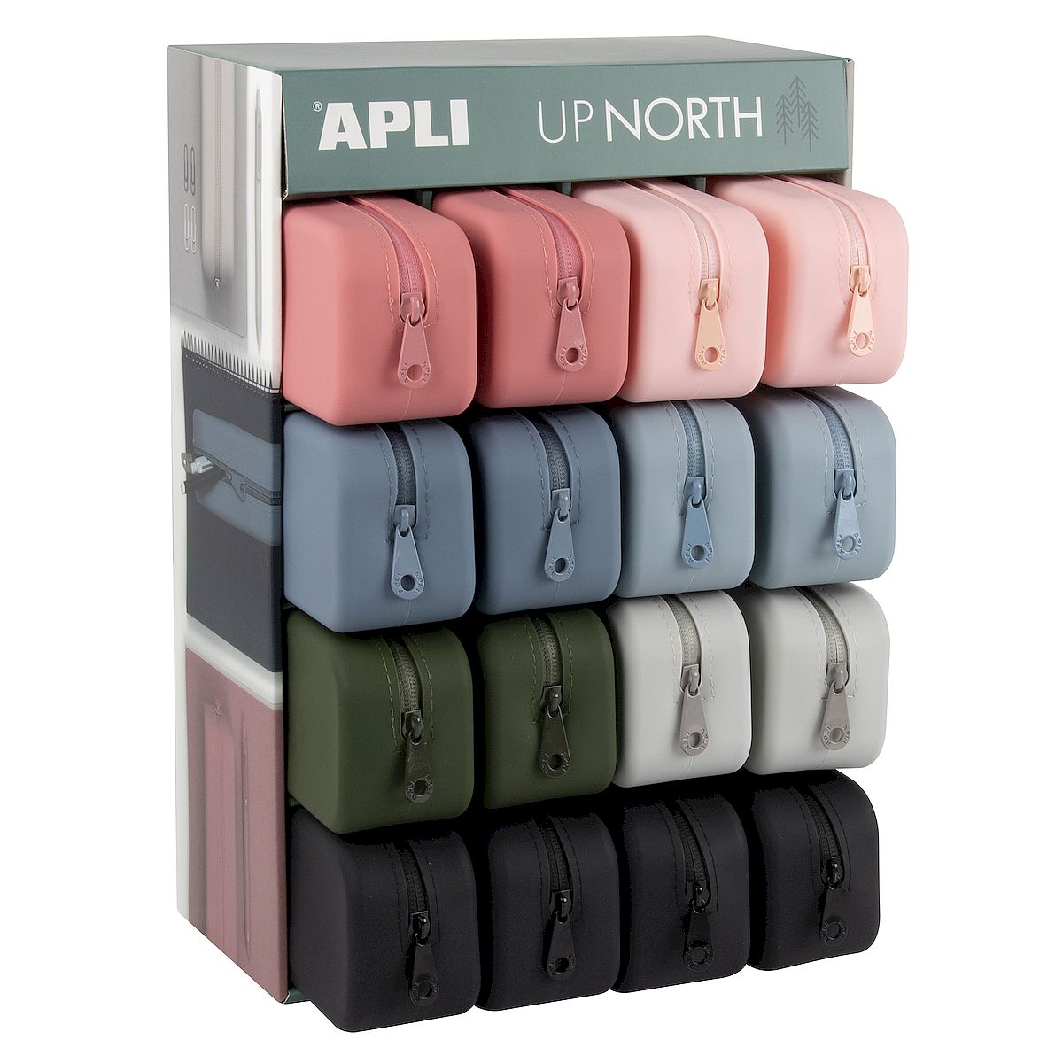 Présentoir de trousses en silicone modèle Up North au format rectangulaire. Sa large palette de couleurs et son design nordique font de cette trousse un accessoire de mode élégant et intemporel. Chaque présentoir contient 16 trousses de dimensions 75 mm x 185 mm x 55 mm. 8 couleurs assorties : noir, rose corail, vert, bleu clair, bleu roi, rose et beige. Ces trousses sont fonctionnelles et minimalistes, avec leurs fermetures éclair hydrofuges et leurs dimensions adaptées à de multiples usages.