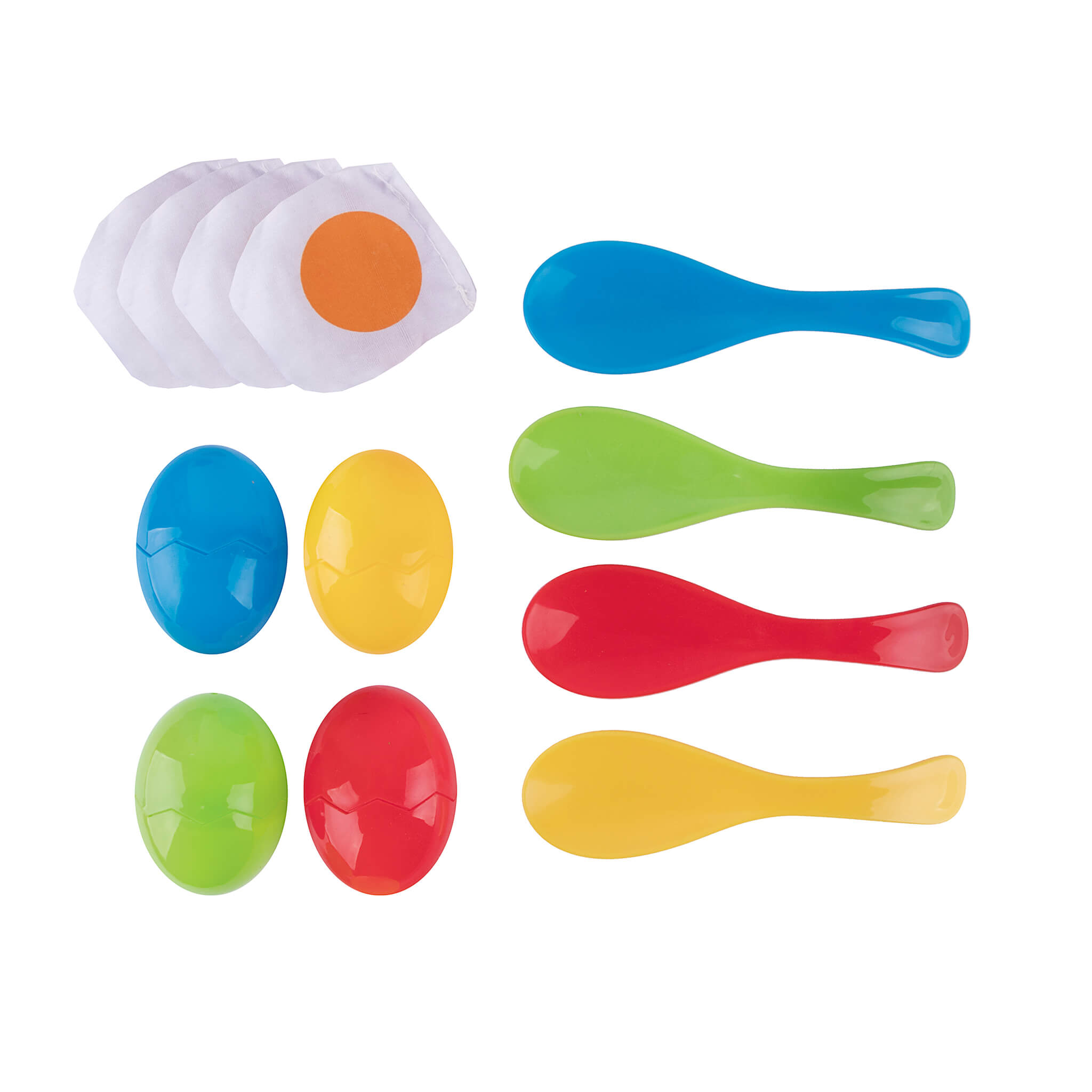 Le jeu contient 4 œufs, 4 œufs sur le plat en tissu, 4 cuillères de couleurs différentes et 1 sac pour ranger le jeu.
