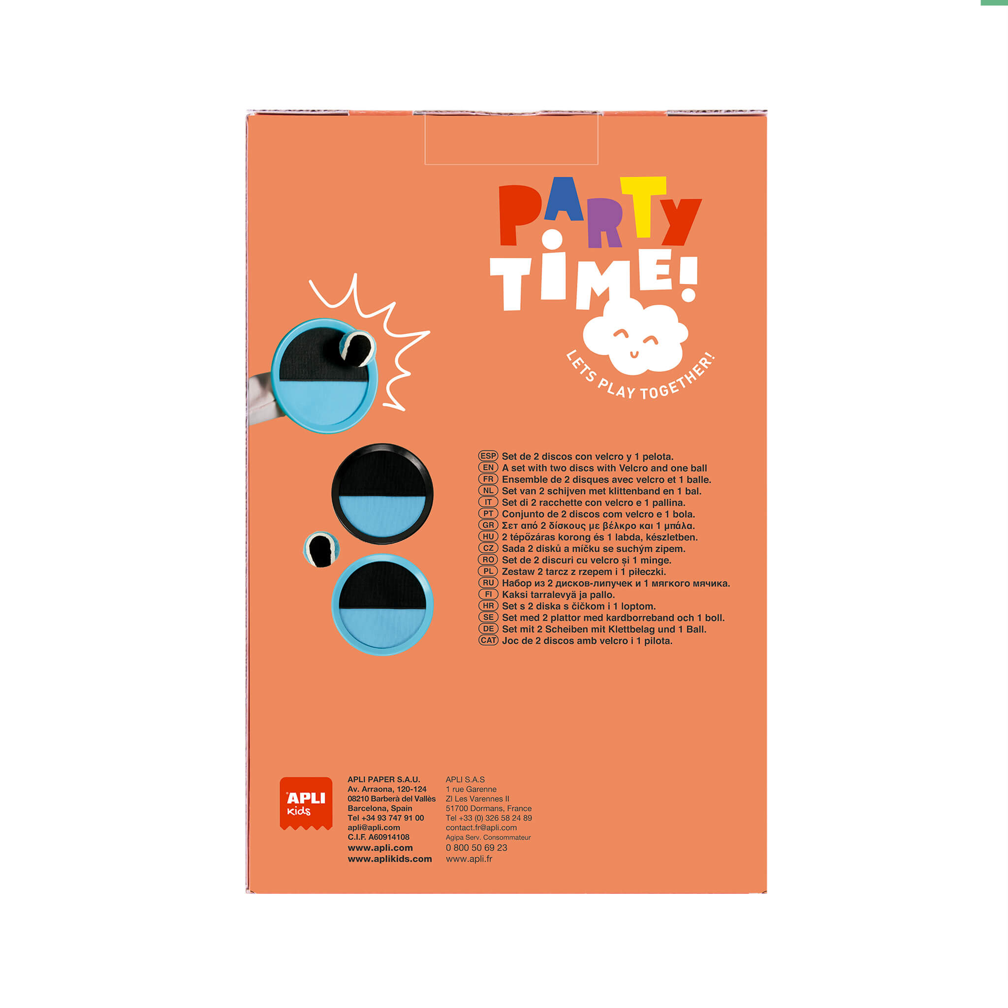 Jeu de catch ball de la collection Party Time. Le jeu consiste à lancer la balle, le partenaire doit la recevoir avec l'aide du disque auto-agrippant